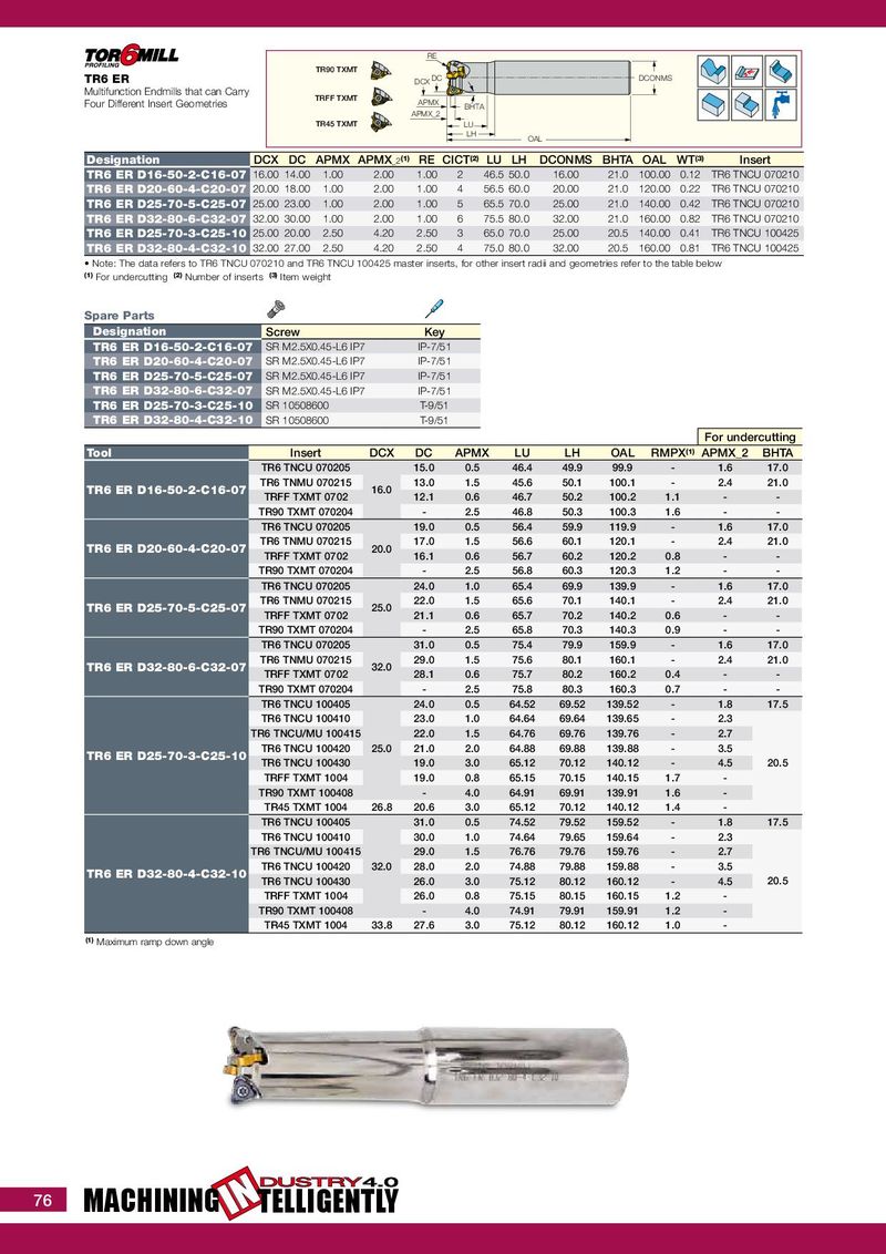 F O R I N T E R N A L U S E O N L Y • S U B J E C T T O C H A N G E RE TR90 TXMT TR6 ER DCX DC DCONMS Multifunction Endmills that can Carry TRFF TXMT Four Different Insert Geometries APMX BHTA APMX_2 TR45 TXMT LU LH OAL Designation DCX DC APMX APMX _2 (1) RE CICT (2) LU LH DCONMS BHTA OAL WT (3) Insert TR6 ER D16-50-2-C16-07 16.00 14.00 1.00 2.00 1.00 2 46.5 50.0 16.00 21.0 100.00 0.12 TR6 TNCU 070210 TR6 ER D20-60-4-C20-07 20.00 18.00 1.00 2.00 1.00 4 56.5 60.0 20.00 21.0 120.00 0.22 TR6 TNCU 070210 TR6 ER D25-70-5-C25-07 25.00 23.00 1.00 2.00 1.00 5 65.5 70.0 25.00 21.0 140.00 0.42 TR6 TNCU 070210 TR6 ER D32-80-6-C32-07 32.00 30.00 1.00 2.00 1.00 6 75.5 80.0 32.00 21.0 160.00 0.82 TR6 TNCU 070210 TR6 ER D25-70-3-C25-10 25.00 20.00 2.50 4.20 2.50 3 65.0 70.0 25.00 20.5 140.00 0.41 TR6 TNCU 100425 TR6 ER D32-80-4-C32-10 32.00 27.00 2.50 4.20 2.50 4 75.0 80.0 32.00 20.5 160.00 0.81 TR6 TNCU 100425 • Note: The data refers to TR6 TNCU 070210 and TR6 TNCU 100425 master inserts, for other insert radii and geometries refer to the table below (1) For undercutting (2) Number of inserts (3) Item weight Spare Parts Designation Screw Key TR6 ER D16-50-2-C16-07 SR M2.5X0.45-L6 IP7 IP-7/51 TR6 ER D20-60-4-C20-07 SR M2.5X0.45-L6 IP7 IP-7/51 TR6 ER D25-70-5-C25-07 SR M2.5X0.45-L6 IP7 IP-7/51 TR6 ER D32-80-6-C32-07 SR M2.5X0.45-L6 IP7 IP-7/51 TR6 ER D25-70-3-C25-10 SR 10508600 T-9/51 TR6 ER D32-80-4-C32-10 SR 10508600 T-9/51 For undercutting Tool Insert DCX DC APMX LU LH OAL RMPX (1) APMX_2 BHTA TR6 TNCU 070205 15.0 0.5 46.4 49.9 99.9 - 1.6 17.0 TR6 TNMU 070215 13.0 1.5 45.6 50.1 100.1 - 2.4 21.0 TR6 ER D16-50-2-C16-07 16.0 TRFF TXMT 0702 12.1 0.6 46.7 50.2 100.2 1.1 - - TR90 TXMT 070204 - 2.5 46.8 50.3 100.3 1.6 - - TR6 TNCU 070205 19.0 0.5 56.4 59.9 119.9 - 1.6 17.0 TR6 TNMU 070215 17.0 1.5 56.6 60.1 120.1 - 2.4 21.0 TR6 ER D20-60-4-C20-07 20.0 TRFF TXMT 0702 16.1 0.6 56.7 60.2 120.2 0.8 - - TR90 TXMT 070204 - 2.5 56.8 60.3 120.3 1.2 - - TR6 TNCU 070205 24.0 1.0 65.4 69.9 139.9 - 1.6 17.0 TR6 TNMU 070215 22.0 1.5 65.6 70.1 140.1 - 2.4 21.0 TR6 ER D25-70-5-C25-07 25.0 TRFF TXMT 0702 21.1 0.6 65.7 70.2 140.2 0.6 - - TR90 TXMT 070204 - 2.5 65.8 70.3 140.3 0.9 - - TR6 TNCU 070205 31.0 0.5 75.4 79.9 159.9 - 1.6 17.0 TR6 TNMU 070215 29.0 1.5 75.6 80.1 160.1 - 2.4 21.0 TR6 ER D32-80-6-C32-07 32.0 TRFF TXMT 0702 28.1 0.6 75.7 80.2 160.2 0.4 - - TR90 TXMT 070204 - 2.5 75.8 80.3 160.3 0.7 - - TR6 TNCU 100405 24.0 0.5 64.52 69.52 139.52 - 1.8 17.5 TR6 TNCU 100410 23.0 1.0 64.64 69.64 139.65 - 2.3 TR6 TNCU/MU 100415 22.0 1.5 64.76 69.76 139.76 - 2.7 TR6 TNCU 100420 25.0 21.0 2.0 64.88 69.88 139.88 - 3.5 TR6 ER D25-70-3-C25-10 TR6 TNCU 100430 19.0 3.0 65.12 70.12 140.12 - 4.5 20.5 TRFF TXMT 1004 19.0 0.8 65.15 70.15 140.15 1.7 - TR90 TXMT 100408 - 4.0 64.91 69.91 139.91 1.6 - TR45 TXMT 1004 26.8 20.6 3.0 65.12 70.12 140.12 1.4 - TR6 TNCU 100405 31.0 0.5 74.52 79.52 159.52 - 1.8 17.5 TR6 TNCU 100410 30.0 1.0 74.64 79.65 159.64 - 2.3 TR6 TNCU/MU 100415 29.0 1.5 76.76 79.76 159.76 - 2.7 TR6 TNCU 100420 32.0 28.0 2.0 74.88 79.88 159.88 - 3.5 TR6 ER D32-80-4-C32-10 TR6 TNCU 100430 26.0 3.0 75.12 80.12 160.12 - 4.5 20.5 TRFF TXMT 1004 26.0 0.8 75.15 80.15 160.15 1.2 - TR90 TXMT 100408 - 4.0 74.91 79.91 159.91 1.2 - TR45 TXMT 1004 33.8 27.6 3.0 75.12 80.12 160.12 1.0 - (1) Maximum ramp down angle DUSTRY 4.0 76 MACHINING IN TELLIGENTLY