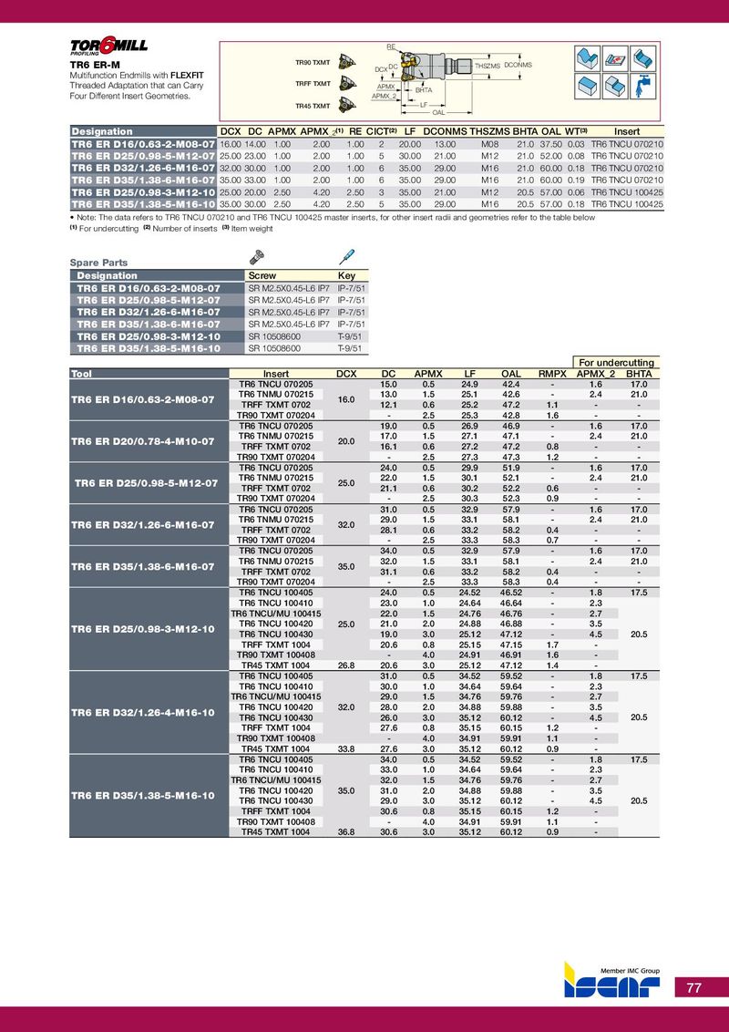 F O R I N T E R N A L U S E O N L Y • S U B J E C T T O C H A N G E F O R I N T E R N A L U S E O N L Y • S U B J E C T T O C H A N G E RE TR90 TXMT TR6 ER-M THSZMS DCONMS DCX DC Multifunction Endmills with FLEXFIT Threaded Adaptation that can Carry TRFF TXMT APMX BHTA Four Different Insert Geometries. APMX_2 TR45 TXMT LF OAL Designation DCX DC APMX APMX _2 (1) RE CICT (2) LF DCONMS THSZMS BHTA OAL WT (3) Insert TR6 ER D16/0.63-2-M08-07 16.00 14.00 1.00 2.00 1.00 2 20.00 13.00 M08 21.0 37.50 0.03 TR6 TNCU 070210 TR6 ER D25/0.98-5-M12-07 25.00 23.00 1.00 2.00 1.00 5 30.00 21.00 M12 21.0 52.00 0.08 TR6 TNCU 070210 TR6 ER D32/1.26-6-M16-07 32.00 30.00 1.00 2.00 1.00 6 35.00 29.00 M16 21.0 60.00 0.18 TR6 TNCU 070210 TR6 ER D35/1.38-6-M16-07 35.00 33.00 1.00 2.00 1.00 6 35.00 29.00 M16 21.0 60.00 0.19 TR6 TNCU 070210 TR6 ER D25/0.98-3-M12-10 25.00 20.00 2.50 4.20 2.50 3 35.00 21.00 M12 20.5 57.00 0.06 TR6 TNCU 100425 TR6 ER D35/1.38-5-M16-10 35.00 30.00 2.50 4.20 2.50 5 35.00 29.00 M16 20.5 57.00 0.18 TR6 TNCU 100425 • Note: The data refers to TR6 TNCU 070210 and TR6 TNCU 100425 master inserts, for other insert radii and geometries refer to the table below (1) For undercutting (2) Number of inserts (3) Item weight Spare Parts Designation Screw Key TR6 ER D16/0.63-2-M08-07 SR M2.5X0.45-L6 IP7 IP-7/51 TR6 ER D25/0.98-5-M12-07 SR M2.5X0.45-L6 IP7 IP-7/51 TR6 ER D32/1.26-6-M16-07 SR M2.5X0.45-L6 IP7 IP-7/51 TR6 ER D35/1.38-6-M16-07 SR M2.5X0.45-L6 IP7 IP-7/51 TR6 ER D25/0.98-3-M12-10 SR 10508600 T-9/51 TR6 ER D35/1.38-5-M16-10 SR 10508600 T-9/51 For undercutting Tool Insert DCX DC APMX LF OAL RMPX APMX_2 BHTA TR6 TNCU 070205 15.0 0.5 24.9 42.4 - 1.6 17.0 TR6 TNMU 070215 13.0 1.5 25.1 42.6 - 2.4 21.0 TR6 ER D16/0.63-2-M08-07 16.0 TRFF TXMT 0702 12.1 0.6 25.2 47.2 1.1 - - TR90 TXMT 070204 - 2.5 25.3 42.8 1.6 - - TR6 TNCU 070205 19.0 0.5 26.9 46.9 - 1.6 17.0 TR6 TNMU 070215 17.0 1.5 27.1 47.1 - 2.4 21.0 TR6 ER D20/0.78-4-M10-07 20.0 TRFF TXMT 0702 16.1 0.6 27.2 47.2 0.8 - - TR90 TXMT 070204 - 2.5 27.3 47.3 1.2 - - TR6 TNCU 070205 24.0 0.5 29.9 51.9 - 1.6 17.0 TR6 TNMU 070215 22.0 1.5 30.1 52.1 - 2.4 21.0 TR6 ER D25/0.98-5-M12-07 25.0 TRFF TXMT 0702 21.1 0.6 30.2 52.2 0.6 - - TR90 TXMT 070204 - 2.5 30.3 52.3 0.9 - - TR6 TNCU 070205 31.0 0.5 32.9 57.9 - 1.6 17.0 TR6 TNMU 070215 29.0 1.5 33.1 58.1 - 2.4 21.0 TR6 ER D32/1.26-6-M16-07 32.0 TRFF TXMT 0702 28.1 0.6 33.2 58.2 0.4 - - TR90 TXMT 070204 - 2.5 33.3 58.3 0.7 - - TR6 TNCU 070205 34.0 0.5 32.9 57.9 - 1.6 17.0 TR6 TNMU 070215 32.0 1.5 33.1 58.1 - 2.4 21.0 TR6 ER D35/1.38-6-M16-07 35.0 TRFF TXMT 0702 31.1 0.6 33.2 58.2 0.4 - - TR90 TXMT 070204 - 2.5 33.3 58.3 0.4 - - TR6 TNCU 100405 24.0 0.5 24.52 46.52 - 1.8 17.5 TR6 TNCU 100410 23.0 1.0 24.64 46.64 - 2.3 TR6 TNCU/MU 100415 22.0 1.5 24.76 46.76 - 2.7 TR6 TNCU 100420 25.0 21.0 2.0 24.88 46.88 - 3.5 TR6 ER D25/0.98-3-M12-10 TR6 TNCU 100430 19.0 3.0 25.12 47.12 - 4.5 20.5 TRFF TXMT 1004 20.6 0.8 25.15 47.15 1.7 - TR90 TXMT 100408 - 4.0 24.91 46.91 1.6 - TR45 TXMT 1004 26.8 20.6 3.0 25.12 47.12 1.4 - TR6 TNCU 100405 31.0 0.5 34.52 59.52 - 1.8 17.5 TR6 TNCU 100410 30.0 1.0 34.64 59.64 - 2.3 TR6 TNCU/MU 100415 29.0 1.5 34.76 59.76 - 2.7 TR6 TNCU 100420 32.0 28.0 2.0 34.88 59.88 - 3.5 TR6 ER D32/1.26-4-M16-10 TR6 TNCU 100430 26.0 3.0 35.12 60.12 - 4.5 20.5 TRFF TXMT 1004 27.6 0.8 35.15 60.15 1.2 - TR90 TXMT 100408 - 4.0 34.91 59.91 1.1 - TR45 TXMT 1004 33.8 27.6 3.0 35.12 60.12 0.9 - TR6 TNCU 100405 34.0 0.5 34.52 59.52 - 1.8 17.5 TR6 TNCU 100410 33.0 1.0 34.64 59.64 - 2.3 TR6 TNCU/MU 100415 32.0 1.5 34.76 59.76 - 2.7 TR6 TNCU 100420 35.0 31.0 2.0 34.88 59.88 - 3.5 TR6 ER D35/1.38-5-M16-10 TR6 TNCU 100430 29.0 3.0 35.12 60.12 - 4.5 20.5 TRFF TXMT 1004 30.6 0.8 35.15 60.15 1.2 - TR90 TXMT 100408 - 4.0 34.91 59.91 1.1 - TR45 TXMT 1004 36.8 30.6 3.0 35.12 60.12 0.9 - 77