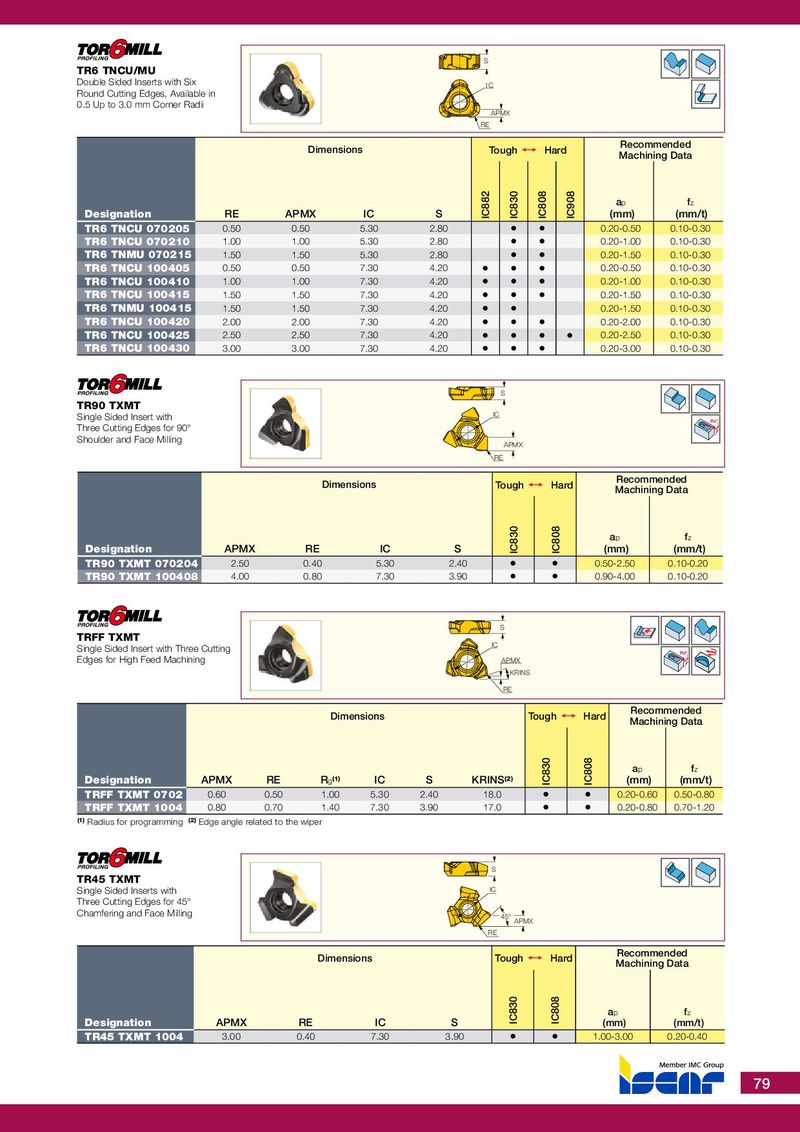 F O R I N T E R N A L U S E O N L Y • S U B J E C T T O C H A N G E F O R I N T E R N A L U S E O N L Y • S U B J E C T T O C H A N G E S TR6 TNCU/MU Double Sided Inserts with Six IC Round Cutting Edges, Available in 0.5 Up to 3.0 mm Corner Radii APMX RE Recommended Dimensions Tough 1 Hard Machining Data a p f z Designation RE APMX IC S IC882 IC830 IC808 IC908 (mm) (mm/t) TR6 TNCU 070205 0.50 0.50 5.30 2.80 • • 0.20-0.50 0.10-0.30 TR6 TNCU 070210 1.00 1.00 5.30 2.80 • • 0.20-1.00 0.10-0.30 TR6 TNMU 070215 1.50 1.50 5.30 2.80 • • 0.20-1.50 0.10-0.30 TR6 TNCU 100405 0.50 0.50 7.30 4.20 • • • 0.20-0.50 0.10-0.30 TR6 TNCU 100410 1.00 1.00 7.30 4.20 • • • 0.20-1.00 0.10-0.30 TR6 TNCU 100415 1.50 1.50 7.30 4.20 • • • 0.20-1.50 0.10-0.30 TR6 TNMU 100415 1.50 1.50 7.30 4.20 • • 0.20-1.50 0.10-0.30 TR6 TNCU 100420 2.00 2.00 7.30 4.20 • • • 0.20-2.00 0.10-0.30 TR6 TNCU 100425 2.50 2.50 7.30 4.20 • • • • 0.20-2.50 0.10-0.30 TR6 TNCU 100430 3.00 3.00 7.30 4.20 • • • 0.20-3.00 0.10-0.30 S TR90 TXMT Single Sided Insert with IC Rd° Three Cutting Edges for 90° Shoulder and Face Milling APMX RE Recommended Dimensions Tough 1 Hard Machining Data a p f z Designation APMX RE IC S IC830 IC808 (mm) (mm/t) TR90 TXMT 070204 2.50 0.40 5.30 2.40 • • 0.50-2.50 0.10-0.20 TR90 TXMT 100408 4.00 0.80 7.30 3.90 • • 0.90-4.00 0.10-0.20 S TRFF TXMT IC Single Sided Insert with Three Cutting Rd° Edges for High Feed Machining APMX KRINS RE Recommended Dimensions Tough 1 Hard Machining Data a p f z Designation APMX RE R g (1) IC S KRINS (2) IC830 IC808 (mm) (mm/t) TRFF TXMT 0702 0.60 0.50 1.00 5.30 2.40 18.0 • • 0.20-0.60 0.50-0.80 TRFF TXMT 1004 0.80 0.70 1.40 7.30 3.90 17.0 • • 0.20-0.80 0.70-1.20 (1) Radius for programming (2) Edge angle related to the wiper S TR45 TXMT Single Sided Inserts with IC Three Cutting Edges for 45° Chamfering and Face Milling 45° APMX RE Recommended Dimensions Tough 1 Hard Machining Data a p f z Designation APMX RE IC S IC830 IC808 (mm) (mm/t) TR45 TXMT 1004 3.00 0.40 7.30 3.90 • • 1.00-3.00 0.20-0.40 79