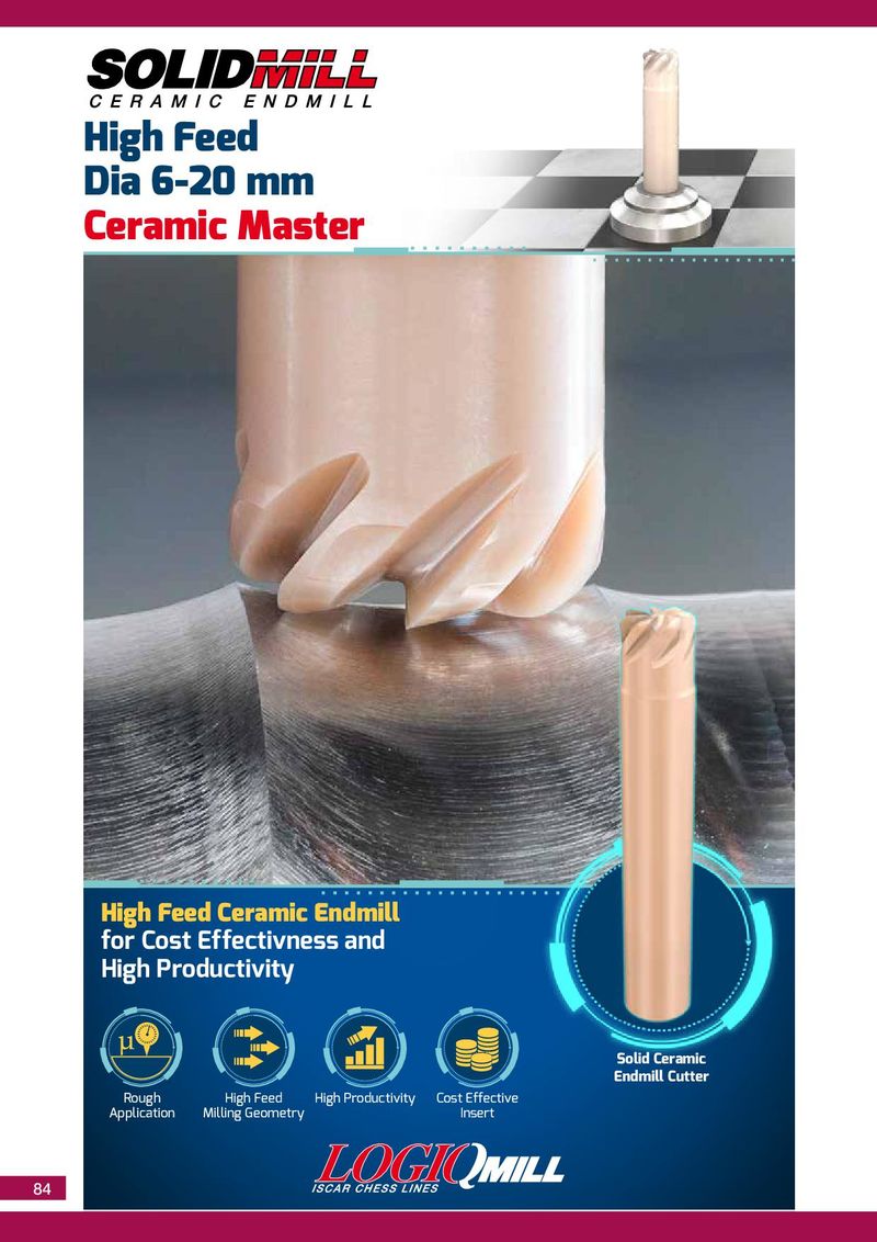F O R I N T E R N A L U S E O N L Y • S U B J E C T T O C H A N G E High Feed Dia 6-20 mm Ceramic Master High Feed Ceramic Endmill for Cost Effectivness and High Productivity Solid Ceramic Endmill Cutter Rough High Feed High Productivity Cost Effective Application Milling Geometry Insert 84