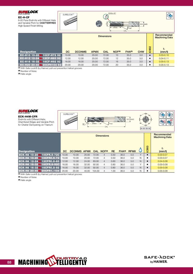 F O R I N T E R N A L U S E O N L Y • S U B J E C T T O C H A N G E CHWx 45° SURELOCK (1) EC-H-CF 6-20 Flute Endmills with Different Helix and Variable Pitch for CHATTERFREE DC DCONMS High Speed Finish Milling APMX FHA˚ OAL Recommended Dimensions Machining Data f z Designation DC DCONMS APMX OAL NOF (2) FHA (3) CHW IC902 (mm/t) EC-H10 10-20SL10CF-H72 92 10.00 10.00 20.00 72.00 10 35.0 3.0 • 0.03-0.10 EC-H12 12-24SL12CF-H83 92 12.00 12.00 20.00 72.00 12 35.0 3.0 • 0.04-0.11 EC-H16 16-32SL16CF-H92 92 16.00 16.00 20.00 72.00 16 35.0 3.0 • 0.05-0.13 EC-H20 20-40SL20CFH104 92 20.00 20.00 20.00 72.00 20 35.0 3.0 • 0.05-0.13 (1) With Safe-Lock® (by Haimer) pull-out prevention helical grooves (2) Number of flutes (3) Helix angle SURELOCK (1) a1° a2° ECK-H4M-CFR Endmills with Different Helix, DC DCONMS Rd° Chamfered Edges and Variable Pitch FHA˚ a4° for Chatter Dampening on Titanium RE APMX a3° OAL a1≠a2≠a3≠a4 Recommended Dimensions Machining Data f z Designation DC DCONMS APMX OAL NOF (2) RE FHA (3) RPMX IC900 (mm/t) ECK-H4 10-20SL10CFR.5-72C 10.00 10.00 20.00 72.00 4 0.50 36.0 5.0 Y • 0.03-0.07 ECK-H4 10-20SL10CFR0.5-72 10.00 10.00 20.00 72.00 4 0.50 36.0 5.0 N • 0.03-0.07 ECK-H4 12-24SL12CFR0.6-83 12.00 12.00 24.00 83.00 4 0.60 36.0 5.0 N • 0.04-0.08 ECK-H4 16-32SL16CFR.8-92C 16.00 16.00 32.00 92.00 4 0.80 36.0 5.0 Y • 0.05-0.08 ECK-H4 16-32SL16CFR0.8-92 16.00 16.00 32.00 92.00 4 0.80 36.0 5.0 N • 0.05-0.08 ECK-H4 20-40SL20CFR1.-104 20.00 20.00 40.00 104.00 4 1.00 36.0 5.0 N • 0.05-0.08 (1) With Safe-Lock® (by Haimer) pull-out prevention helical grooves (2) Number of flutes (3) Helix angle DUSTRY 4.0 88 88 MACHINING IN TELLIGENTLY