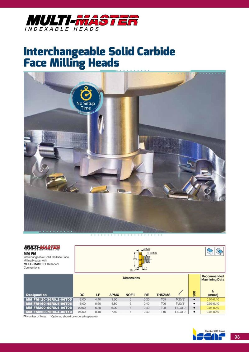 F O R I N T E R N A L U S E O N L Y • S U B J E C T T O C H A N G E F O R I N T E R N A L U S E O N L Y • S U B J E C T T O C H A N G E I N D E X A B L E H E A D S Interchangeable Solid Carbide Face Milling Heads No Setup Time APMX MM FM THSZMS Interchangeable Solid Carbide Face DC Milling Heads with MULTI-MASTER Threaded Connections LF RE Recommended Dimensions Machining Data f z Designation DC LF APMX NOF (1) RE THSZMS 908 (mm/t) MM FM120-36R0.2-06T05 12.00 4.40 3.60 6 0.20 T05 T-20/3* • 0.04-0.10 MM FM160-48R0.4-06T06 16.00 5.60 4.80 6 0.40 T06 T-20/3* • 0.05-0.10 MM FM200-60R0.4-06T08 20.00 6.80 6.00 6 0.40 T08 T-40/3 L* • 0.05-0.10 MM FM250-75R0.4-06T10 25.00 8.40 7.50 6 0.40 T10 T-40/3 L* • 0.05-0.10 (1) Number of flutes * Optional, should be ordered separately 93