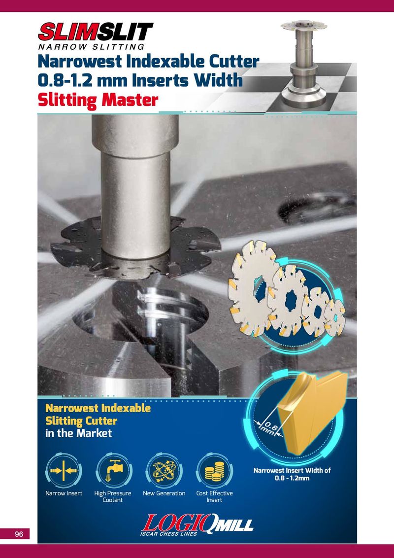 F O R I N T E R N A L U S E O N L Y • S U B J E C T T O C H A N G E SLIMSLIT N A R R O W S L I T T I N G Narrowest Indexable Cutter 0.8-1.2 mm Inserts Width Slitting Master Narrowest Indexable Slitting Cutter in the Market Narrowest Insert Width of 0.8 - 1.2mm Narrow Insert High Pressure New Generation Cost Effective Coolant Insert 96