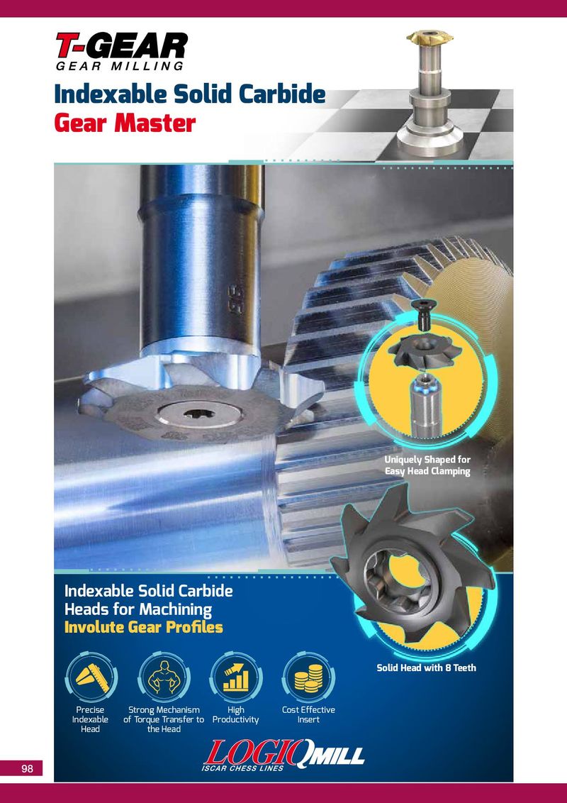 F O R I N T E R N A L U S E O N L Y • S U B J E C T T O C H A N G E Indexable Solid Carbide Gear Master Uniquely Shaped for Easy Head Clamping Indexable Solid Carbide Heads for Machining Involute Gear Profiles Solid Head with 8 Teeth Precise Strong Mechanism High Cost Effective Indexable of Torque Transfer to Productivity Insert Head the Head 98