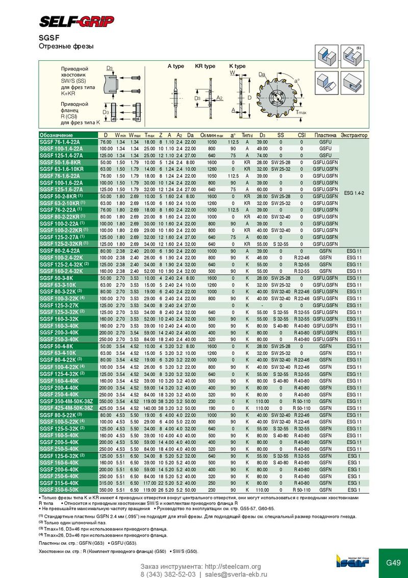 SGSF Отрезные фрезы (5) D 3 A type KR type K type Приводной W хвостовик Da SW/S (SS) a° для фрез типа K+KR D 3 A 2 D Приводной фланец A D 3 Tmax R (CSI) для фрез типа K Обозначение D W min W max T max Z A A 2 Da О б/ мин max a° Тип /d D 3 SS CSI Пластина Экстрактор SGSF 76-1.4-22A 76.00 1.34 1.34 18.00 8 1.10 2.4 22.00 1050 112.5 A 39.00 0 0 GSFU SGSF 100-1.4-22A 100.00 1.34 1.34 25.00 10 1.10 2.4 22.00 800 90 A 49.00 0 0 GSFU SGSF 125-1.4-27A 125.00 1.34 1.34 25.00 12 1.10 2.4 27.00 640 75 A 74.00 0 0 GSFU SGSF 50-1.6-8KR 50.00 1.50 1.79 10.00 5 1.24 2.4 8.00 1600 0 KR 28.00 SW 25-28 0 GSFU,GSFN SGSF 63-1.6-10KR 63.00 1.50 1.79 14.00 6 1.24 2.4 10.00 1260 0 KR 32.00 SW 25-32 0 GSFU,GSFN SGSF 76-1.6-22A 76.00 1.50 1.79 18.00 8 1.24 2.4 22.00 1050 112.5 A 39.00 0 0 GSFU,GSFN SGSF 100-1.6-22A 100.00 1.50 1.79 30.00 10 1.24 2.4 22.00 800 90 A 39.00 0 0 GSFU,GSFN SGSF 125-1.6-27A 125.00 1.50 1.79 32.00 12 1.24 2.4 27.00 640 75 A 60.00 0 0 GSFU,GSFN ESG 1.4-2 SGSF 50-2-8KR (1) 50.00 1.80 2.69 10.00 5 1.60 2.4 8.00 1600 0 KR 28.00 SW 25-28 0 GSFU,GSFN SGSF 63-2-10KR (1) 63.00 1.80 2.69 15.00 6 1.60 2.4 10.00 1260 0 KR 32.00 SW 25-32 0 GSFU,GSFN SGSF 76-2-22A (1) 76.00 1.80 2.69 18.00 8 1.60 2.4 22.00 1050 112.5 A 39.00 0 0 GSFU,GSFN SGSF 80-2-22KR (1) 80.00 1.80 2.69 20.00 8 1.60 2.4 22.00 1000 0 KR 40.00 SW 32-40 0 GSFU,GSFN SGSF 100-2-22A (1) 100.00 1.80 2.69 30.00 10 1.60 2.4 22.00 800 90 A 39.00 0 0 GSFU,GSFN SGSF 100-2-22KR (1) 100.00 1.80 2.69 29.00 10 1.60 2.4 22.00 800 0 KR 40.00 SW 32-40 0 GSFU,GSFN SGSF 125-2-27A (1) 125.00 1.80 2.69 32.00 12 1.60 2.4 27.00 640 75 A 60.00 0 0 GSFU,GSFN SGSF 125-2-32KR (1) 125.00 1.80 2.69 34.00 12 1.60 2.4 32.00 640 0 KR 55.00 S 32-55 0 GSFU,GSFN SGSF 80-2.4-22A 80.00 2.38 2.40 20.00 6 1.90 2.4 22.00 1000 90 A 39.00 0 0 GSFN ESG 11 SGSF 100-2.4-22K 100.00 2.38 2.40 26.00 6 1.90 2.4 22.00 800 90 K 46.00 0 R 22-46 GSFN ESG 11 SGSF 125-2.4-32K (2) 125.00 2.38 2.40 34.00 8 1.90 2.4 32.00 640 0 K 55.00 0 R 32-55 GSFN ESG 11 SGSF 160-2.4-32K 160.00 2.38 2.40 52.00 10 1.90 2.4 32.00 500 90 K 55.00 0 R 32-55 GSFN ESG 11 SGSF 50-3-8K 50.00 2.70 3.53 10.00 4 2.40 2.4 8.00 1600 0 K 28.00 SW 25-28 0 GSFU,GSFN ESG 11 SGSF 63-3-10K 63.00 2.70 3.53 15.00 5 2.40 2.4 10.00 1260 0 K 32.00 SW 25-32 0 GSFU,GSFN ESG 11 SGSF 80-3-22K (3) 80.00 2.70 3.53 19.00 6 2.40 2.4 22.00 1000 0 K 40.00 SW 32-40 R 22-46 GSFU,GSFN ESG 11 SGSF 100-3-22K (4) 100.00 2.70 3.53 29.00 6 2.40 2.4 22.00 800 90 K 40.00 SW 32-40 R 22-46 GSFU,GSFN ESG 11 SGSF 125-3-27K 125.00 2.70 3.53 34.00 8 2.40 2.4 27.00 0 K - 0 0 GSFU,GSFN ESG 11 SGSF 125-3-32K (2) 125.00 2.70 3.53 34.00 8 2.40 2.4 32.00 640 0 K 55.00 S 32-55 R 32-55 GSFU,GSFN ESG 11 SGSF 160-3-32K 160.00 2.70 3.53 52.00 10 2.40 2.4 32.00 500 90 K 55.00 S 32-55 R 32-55 GSFU,GSFN ESG 11 SGSF 160-3-40K 160.00 2.70 3.53 39.00 10 2.40 2.4 40.00 500 90 K 80.00 S 40-80 R 40-80 GSFU,GSFN ESG 11 SGSF 200-3-40K 200.00 2.70 3.54 59.00 14 2.40 2.4 40.00 400 90 K 80.00 0 R 40-80 GSFU,GSFN ESG 11 SGSF 250-3-40K 250.00 2.70 3.53 84.00 18 2.40 2.4 40.00 320 90 K 80.00 0 R 40-80 GSFU,GSFN ESG 11 SGSF 50-4-8K 50.00 3.54 4.52 10.00 4 3.20 3.2 8.00 1600 0 K 28.00 SW 25-28 0 GSFN ESG 11 SGSF 63-4-10K 63.00 3.54 4.52 15.00 5 3.20 3.2 10.00 1260 0 K 32.00 SW 25-32 0 GSFN ESG 11 SGSF 80-4-22K (3) 80.00 3.54 4.52 19.00 6 3.20 3.2 22.00 1000 0 K 40.00 SW 32-40 R 22-46 GSFN ESG 11 SGSF 100-4-22K (4) 100.00 3.54 4.52 26.00 6 3.20 3.2 22.00 800 90 K 40.00 SW 32-40 R 22-46 GSFN ESG 11 SGSF 125-4-32K (2) 125.00 3.54 4.52 34.00 8 3.20 3.2 32.00 640 0 K 55.00 S 32-55 R 32-55 GSFN ESG 11 SGSF 160-4-40K 160.00 3.54 4.52 39.00 10 3.20 3.2 40.00 500 90 K 80.00 S 40-80 R 40-80 GSFN ESG 11 SGSF 200-4-40K 200.00 3.54 4.52 59.00 14 3.20 3.2 40.00 400 90 K 80.00 0 R 40-80 GSFN ESG 11 SGSF 250-4-40K 250.00 3.54 4.52 84.00 18 3.20 3.2 40.00 320 90 K 80.00 0 R 40-80 GSFN ESG 11 SGSF 350-4M-50K-38Z 350.00 3.54 4.52 119.00 38 3.20 3.2 50.00 230 0 K 110.00 0 R 50-110 GSFN ESG 11 SGSF 425-4M-50K-38Z 425.00 3.54 4.52 140.00 38 3.20 3.2 50.00 190 0 K 110.00 0 R 50-110 GSFN ESG 11 SGSF 80-5-22K (3) 80.00 4.53 5.50 19.00 6 4.00 4.0 22.00 1000 90 K 40.00 SW 32-40 R 22-46 GSFN ESG 11 SGSF 100-5-22K (4) 100.00 4.53 5.50 29.00 6 4.00 5.0 22.00 800 90 K 40.00 SW 32-40 R 22-46 GSFN ESG 11 SGSF 125-5-32K (2) 125.00 4.53 5.50 34.00 8 4.00 4.0 32.00 640 0 K 55.00 S 32-55 R 32-55 GSFN ESG 11 SGSF 160-5-40K 160.00 4.53 5.50 39.00 10 4.00 4.0 40.00 500 90 K 80.00 S 40-80 R 40-80 GSFN ESG 11 SGSF 200-5-40K 200.00 4.53 5.50 59.00 14 4.00 4.0 40.00 400 90 K 80.00 0 R 40-80 GSFN ESG 11 SGSF 250-5-40K 250.00 4.53 5.50 84.00 18 4.00 4.0 40.00 320 90 K 80.00 0 R 40-80 GSFN ESG 11 SGSF 125-6-32K (2) 125.00 5.51 6.50 34.00 8 5.20 5.2 32.00 640 90 K 55.00 S 32-55 R 32-55 GSFN ESG 1 SGSF 160-6-40K 160.00 5.51 6.50 39.00 10 5.20 5.2 40.00 500 90 K 80.00 S 40-80 R 40-80 GSFN ESG 1 SGSF 200-6-40K 200.00 5.51 6.50 59.00 14 5.20 5.2 40.00 400 90 K 80.00 0 R 40-80 GSFN ESG 1 SGSF 250-6-40K 250.00 5.51 6.50 84.00 18 5.20 5.2 40.00 320 90 K 80.00 0 R 40-80 GSFN ESG 1 SGSF 315-6-40K 315.00 5.51 6.50 117.00 22 5.20 5.2 40.00 250 90 K 80.00 0 R 40-80 GSFN ESG 1 SGSF 350-6-50K 350.00 5.51 6.50 119.00 26 5.20 5.2 50.00 230 90 K 110.00 0 R 50-110 GSFN ESG 1 • Только фрезы типа K и KR имеют 4 приводных отверстия вокруг центрального отверстия, они могут использоваться с приводными хвостовиками R типа • Относится к приводным хвостовикам SW/S и комплектам приводного фланца R • Не превышайте максимальную частоту вращения • Руководство по эксплуатации см. стр. G55-57, G60-65. (1) Стандартные пластины GSFN 2.4 мм (.095”) не подходят для этой фр