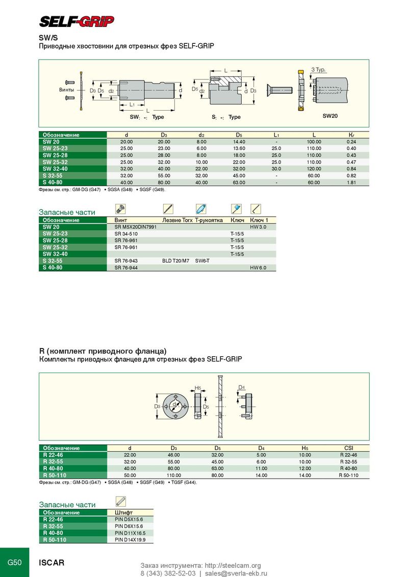 SW/S Приводные хвостовики для отрезных фрез SELF-GRIP L 3 Typ. Винты D 3 D5 d2 d D 5 d2 d D 3 L 1 L SW : - : Type S : - : Type SW20 Обозначение d D 3 d 2 D 5 L 1 L К г SW 20 20.00 20.00 8.00 14.40 - 100.00 0.24 SW 25-23 25.00 23.00 6.00 13.60 25.0 110.00 0.40 SW 25-28 25.00 28.00 8.00 18.00 25.0 110.00 0.43 SW 25-32 25.00 32.00 10.00 22.00 25.0 110.00 0.47 SW 32-40 32.00 40.00 22.00 32.00 30.0 120.00 0.84 S 32-55 32.00 55.00 32.00 45.00 - 60.00 0.82 S 40-80 40.00 80.00 40.00 63.00 - 60.00 1.81 Фрезы см. стр.: GM-DG (G47) • SGSA (G48) • SGSF (G49). Запасные части Обозначение Винт Лезвие Torx T-рукоятка Ключ Ключ 1 SW 20 SR M5X20DIN7991 HW 3.0 SW 25-23 SR 34-510 T-15/5 SW 25-28 SR 76-961 T-15/5 SW 25-32 SR 76-961 T-15/5 SW 32-40 T-15/5 S 32-55 SR 76-943 BLD T20/M7 SW6-T S 40-80 SR 76-944 HW 6.0 R (комплект приводного фланца) Комплекты приводных фланцев для отрезных фрез SELF-GRIP H 5 D 4 D 3 d D 5 Обозначение d D 3 D 5 D 4 H 5 CSI R 22-46 22.00 46.00 32.00 5.00 10.00 R 22-46 R 32-55 32.00 55.00 45.00 6.00 10.00 R 32-55 R 40-80 40.00 80.00 63.00 11.00 12.00 R 40-80 R 50-110 50.00 110.00 80.00 14.00 14.00 R 50-110 Фрезы см. стр.: GM-DG (G47) • SGSA (G48) • SGSF (G49) • TGSF (G44). Запасные части Обозначение Штифт R 22-46 PIN D5X15.6 R 32-55 PIN D6X15.6 R 40-80 PIN D11X16.5 R 50-110 PIN D14X19.9 G50 ISCAR Заказ инструмента: http://steelcam.org 8 (343) 382-52-03 | sales@sverla-ekb.ru