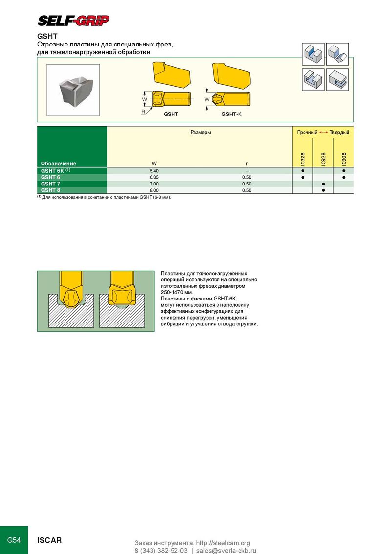 GSHT Отрезные пластины для специальных фрез, для тяжелонаргруженной обработки W W R GSHT GSHT-K Размеры Прочный Ö Твердый Обозначение W r IC328 IC928 IC908 GSHT 6K (1) 5.40 - l l GSHT 6 6.35 0.50 l l GSHT 7 7.00 0.50 l GSHT 8 8.00 0.50 l (1) Для использования в сочетании с пластинами GSHT (6-8 мм). Пластины для тяжелонагруженных операций используются на специально изготовленных фрезах диаметром 250-1470 мм. Пластины с фасками GSHT-6K могут использоваться в наполовину эффективных конфигурациях для снижения перегрузок, уменьшения вибрации и улучшения отвода стружки. G54 ISCAR Заказ инструмента: http://steelcam.org 8 (343) 382-52-03 | sales@sverla-ekb.ru