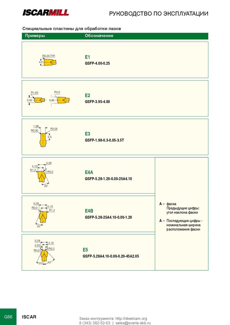 РУКОВОДСТВО ПО ЭКСПЛУАТАЦИИ Специальные пластины для обработки пазов Примеры Обозначение R0.25 TYP. E1 4.0 GSFP-4.00-0.25 R1.65 R4.0 E2 3.30 3.95 GSFP-3.95-4.00 1.98 R0.05 R0.30 E3 3.5 GSFP-1.98-0.3-0.05-3.5T 5.28 4.10 R1.2 R0.0 E4A GSFP-5.28-1.20-0.00-25A4.10 25° 5.28 A – фаска 4.10 R0.0 Предыдущие цифры: R1.2 E4B угол наклона фаски GSFP-5.28-25A4.10-0.00-1.20 A – Последующие цифры - 25° номинальная ширина расположения фаски 5.28 4.10 2.05 R0.2 R0.0 E5 GSFP-5.28A4.10-0.00-0.20-45A2.05 25° 45° G56 ISCAR Заказ инструмента: http://steelcam.org 8 (343) 382-52-03 | sales@sverla-ekb.ru