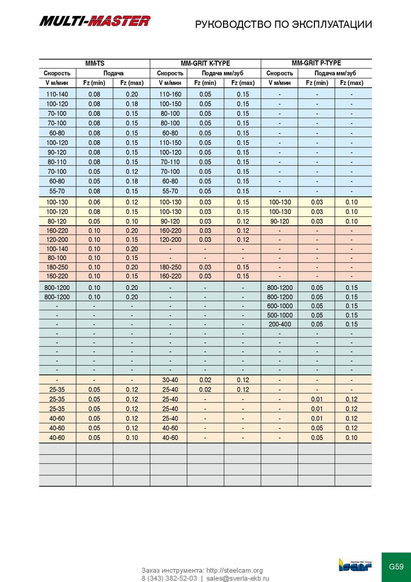 РУКОВОДСТВО ПО ЭКСПЛУАТАЦИИ MM-TS MM-GRIT K-TYPE MM-GRIT P-TYPE Скорость Подача Скорость Подача мм/зуб Скорость Подача мм/зуб V м/мин Fz (min) Fz (max) V м/мин Fz (min) Fz (max) V м/мин Fz (min) Fz (max) 110-140 0.08 0.20 110-160 0.05 0.15 - - - 100-120 0.08 0.18 100-150 0.05 0.15 - - - 70-100 0.08 0.15 80-100 0.05 0.15 - - - 70-100 0.08 0.15 80-100 0.05 0.15 - - - 60-80 0.08 0.15 60-80 0.05 0.15 - - - 100-120 0.08 0.15 110-150 0.05 0.15 - - - 90-120 0.08 0.15 100-120 0.05 0.15 - - - 80-110 0.08 0.15 70-110 0.05 0.15 - - - 70-100 0.05 0.12 70-100 0.05 0.15 - - - 60-80 0.05 0.18 60-80 0.05 0.15 - - - 55-70 0.08 0.15 55-70 0.05 0.15 - - - Ферритная/мартенситная 680 200 12 100-130 0.06 0.12 100-130 0.03 0.15 100-130 0.03 0.10 M Мартенситная 820 240 13 100-120 0.08 0.15 100-130 0.03 0.15 100-130 0.03 0.10 Аустенитная 600 180 14 80-120 0.05 0.10 90-120 0.03 0.12 90-120 0.03 0.10 Ферритный 160 15 160-220 0.10 0.20 160-220 0.03 0.12 - - - Перлитный 250 16 120-200 0.10 0.15 120-200 0.03 0.12 - - - Перлитный/ферритный 180 17 100-140 0.10 0.20 - - - - - - K Перлитный/мартенситный 260 18 80-100 0.10 0.15 - - - - - - Ферритный 130 19 180-250 0.10 0.20 180-250 0.03 0.15 - - - Перлитный 230 20 160-220 0.10 0.15 160-220 0.03 0.15 - - - 800-1200 0.10 0.20 - - - 800-1200 0.05 0.15 800-1200 0.10 0.20 - - - 800-1200 0.05 0.15 - - - - - - 600-1000 0.05 0.15 - - - - - - 500-1000 0.05 0.15 - - - - - - 200-400 0.05 0.15 - - - - - - - - - - - - - - - - - - - - - - - - - - - - - - - - - - - - - - - - - - - - - - - - 30-40 0.02 0.12 - - - 25-35 0.05 0.12 25-40 0.02 0.12 - - - 25-35 0.05 0.12 25-40 - - - 0.01 0.12 25-35 0.05 0.12 25-40 - - - 0.01 0.12 40-60 0.05 0.12 25-40 - - - 0.01 0.12 40-60 0.05 0.12 40-60 - - - 0.05 0.12 40-60 0.05 0.10 40-60 - - - 0.05 0.10 G59 Заказ инструмента: http://steelcam.org 8 (343) 382-52-03 | sales@sverla-ekb.ru