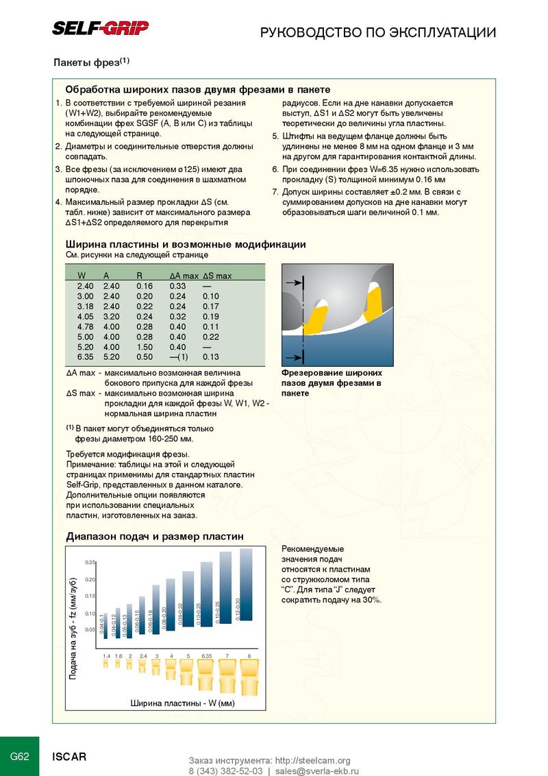 РУКОВОДСТВО ПО ЭКСПЛУАТАЦИИ (1) Пакеты фрез Обработка широких пазов двумя фрезами в пакете 1. В соответствии с требуемой шириной резания радиусов. Если на дне канавки допускается (W1+W2), выбирайте рекомендуемые выступ, ∆S1 и ∆S2 могут быть увеличены комбинации фрех SGSF (A, B или C) из таблицы теоретически до величины угла пластины. на следующей странице. 5. Штифты на ведущем фланце должны быть 2. Диаметры и соединительные отверстия должны удлинены не менее 8 мм на одном фланце и 3 мм совпадать. на другом для гарантирования контактной длины. 3. Все фрезы (за исключением ø125) имеют два 6. При соединении фрез W=6.35 нужно использовать шпоночных паза для соединения в шахматном прокладку (S) толщиной минимум 0.16 мм порядке. 7. Допуск ширины составляет ±0.2 мм. В связи с 4. Максимальный размер прокладки ∆S (см. суммированием допусков на дне канавки могут табл. ниже) зависит от максимального размера образовываться шаги величиной 0.1 мм. ∆S1+∆S2 определяемого для перекрытия Ширина пластины и возможные модификации См. рисунки на следующей странице W A R ∆A max ∆S max 2.40 2.40 0.16 0.33 — 3.00 2.40 0.20 0.24 0.10 3.18 2.40 0.22 0.24 0.17 4.05 3.20 0.24 0.32 0.19 4.78 4.00 0.28 0.40 0.11 5.00 4.00 0.28 0.40 0.22 5.20 4.00 1.50 0.40 — 6.35 5.20 0.50 —(1) 0.13 ∆A max - максимально возможная величина Фрезерование широких бокового припуска для каждой фрезы пазов двумя фрезами в ∆S max - максимально возможная ширина пакете прокладки для каждой фрезы W, W1, W2 - нормальная ширина пластин (1) В пакет могут объединяться только фрезы диаметром 160-250 мм. Требуется модификация фрезы. Примечание: таблицы на этой и следующей страницах применимы для стандартных пластин Self-Grip, представленных в данном каталоге. Дополнительные опции появляются при использовании специальных пластин, изготовленных на заказ. Диапазон подач и размер пластин Рекомендуемые 0.25 значения подач относятся к пластинам 0.20 со стружколомом типа “С”. Для типа “J” следует 0.15 сократить подачу на 30%. 0.10 0.12-0.30 0.08-0.22 0.10-0.25 0.10-0.25 0.05 0.08-0.20 0.04-0.1 0.06-0.15 0.06-0.18 0.04-0.12 0.05-0.13 1.4 1.6 2 2.4 3 4 5 6.35 7 8 Подача на зуб - fz (мм/зуб) Ширина пластины - W (мм) G62 ISCAR Заказ инструмента: http://steelcam.org 8 (343) 382-52-03 | sales@sverla-ekb.ru