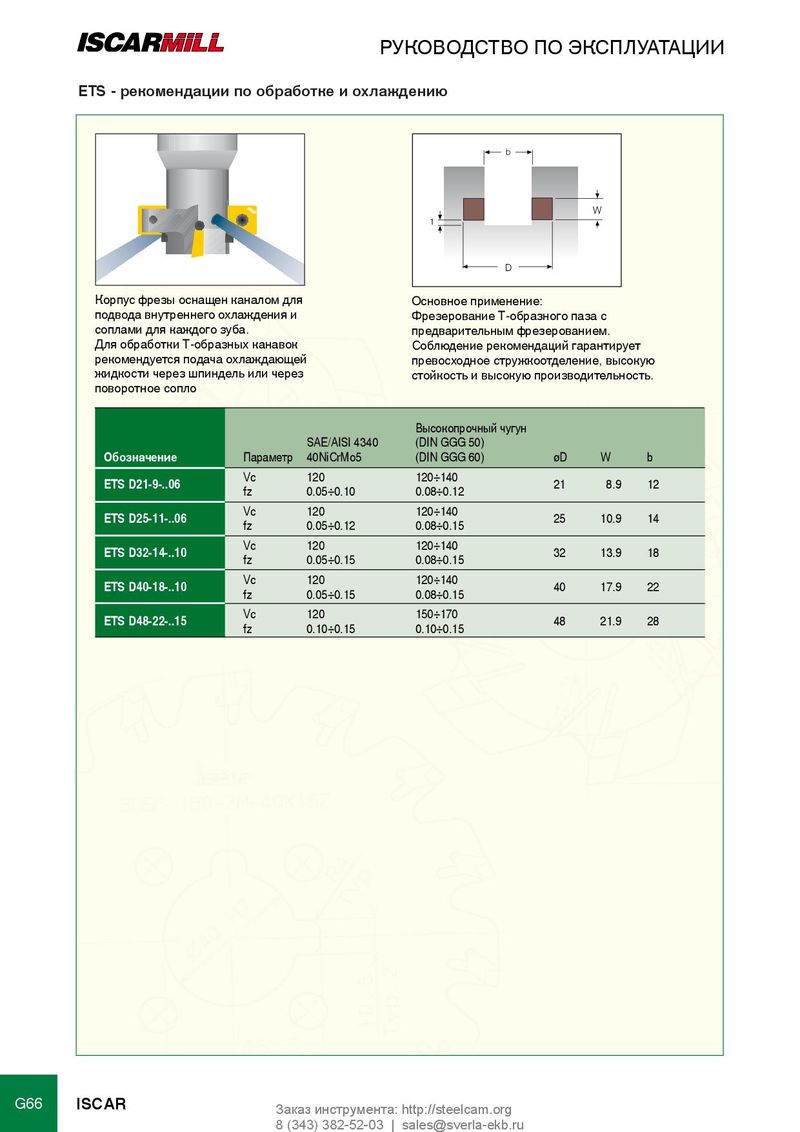 РУКОВОДСТВО ПО ЭКСПЛУАТАЦИИ ETS - рекомендации по обработке и охлаждению b W 1 D Корпус фрезы оснащен каналом для Основное применение: подвода внутреннего охлаждения и Фрезерование Т-образного паза с соплами для каждого зуба. предварительным фрезерованием. Для обработки Т-образных канавок Соблюдение рекомендаций гарантирует рекомендуется подача охлаждающей превосходное стружкоотделение, высокую жидкости через шпиндель или через стойкость и высокую производительность. поворотное сопло Высокопрочный чугун SAE/AISI 4340 (DIN GGG 50) Обозначение Параметр 40NiCrMo5 (DIN GGG 60) øD W b Vc 120 120÷140 ETS D21-9-..06 21 8.9 12 fz 0.05÷0.10 0.08÷0.12 Vc 120 120÷140 ETS D25-11-..06 25 10.9 14 fz 0.05÷0.12 0.08÷0.15 Vc 120 120÷140 ETS D32-14-..10 32 13.9 18 fz 0.05÷0.15 0.08÷0.15 Vc 120 120÷140 ETS D40-18-..10 40 17.9 22 fz 0.05÷0.15 0.08÷0.15 Vc 120 150÷170 ETS D48-22-..15 48 21.9 28 fz 0.10÷0.15 0.10÷0.15 G66 ISCAR Заказ инструмента: http://steelcam.org 8 (343) 382-52-03 | sales@sverla-ekb.ru