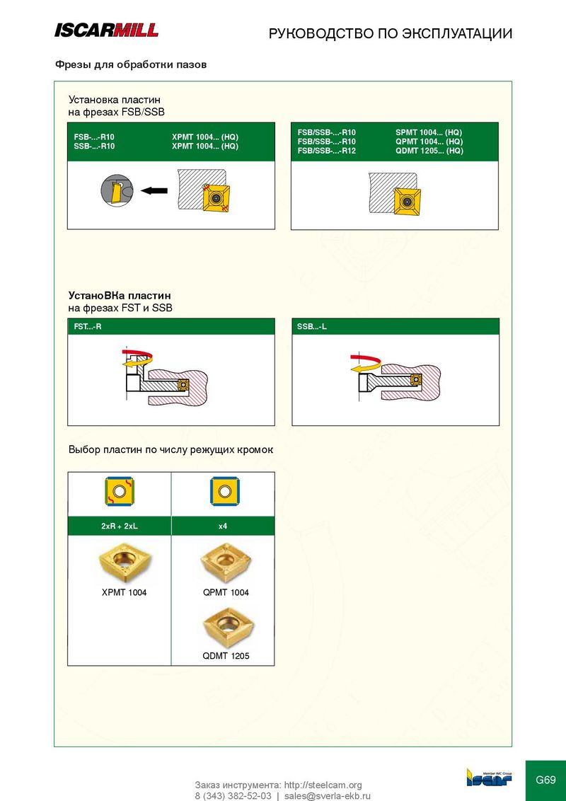 РУКОВОДСТВО ПО ЭКСПЛУАТАЦИИ Фрезы для обработки пазов Установка пластин на фрезах FSB/SSB FSB/SSB-...-R10 SPMT 1004... (HQ) FSB-...-R10 XPMT 1004... (HQ) FSB/SSB-...-R10 QPMT 1004... (HQ) SSB-...-R10 XPMT 1004... (HQ) FSB/SSB-...-R12 QDMT 1205... (HQ) УстаноВКа пластин на фрезах FST и SSB FST...-R SSB...-L Выбор пластин по числу режущих кромок 2xR + 2xL x4 XPMT 1004 QPMT 1004 QDMT 1205 G69 Заказ инструмента: http://steelcam.org 8 (343) 382-52-03 | sales@sverla-ekb.ru