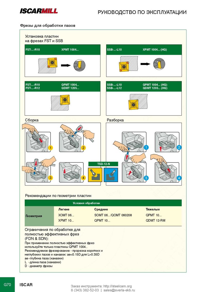 РУКОВОДСТВО ПО ЭКСПЛУАТАЦИИ Фрезы для обработки пазов Установка пластин на фрезах FST и SSB FST-...-R10 XPMT 1004... SSB-...-L10 XPMT 1004... (HQ) FST-...-R10 QPMT 1004... SSB-...-L10 QPMT 1004... (HQ) FST-...-R12 QDMT 1205... SSB-...-L12 QDMT 1205... (HQ) Сборка Разборка 1 2 1 2 TSD-12-N 3 4 3 4 Рекомендации по геометрии пластин Условия обработки Легкие Средние Тяжелые Геометрия XOMT 06... SOMT 06.../QOMT 060208 QPMT 10... XPMT 10... QPMT 10... QDMT 12-RM Ограничения по обработке для полностью эффективных фрез (FDN & SDN): При применении полностью эффективных фрез используйте только пластины QPMT 1004.. Рекомендуемое фрезерование - прорезка коротких и неглубоких пазов и канавок: ae<0.15D для L>0.35D ae - глубина паза (канавки) L - длина паза (канавки) D - диаметр фрезы G70 ISCAR Заказ инструмента: http://steelcam.org 8 (343) 382-52-03 | sales@sverla-ekb.ru
