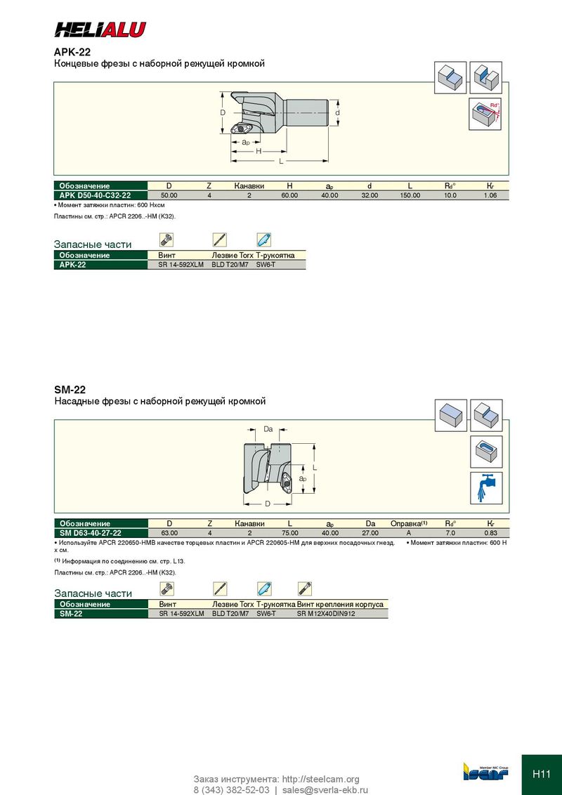 APK-22 Концевые фрезы с наборной режущей кромкой Rd° D d ap H L Обозначение D Z Канавки H a p d L R d ° К г APK D50-40-C32-22 50.00 4 2 60.00 40.00 32.00 150.00 10.0 1.06 • Момент затяжки пластин: 600 Нxсм Пластины см. стр.: APCR 2206..-HM (K32). Запасные части Обозначение Винт Лезвие Torx Т-рукоятка APK-22 SR 14-592XLM BLD T20/M7 SW6-T SM-22 Насадные фрезы с наборной режущей кромкой Da L ap D Обозначение D Z Канавки L a p Da Оправка (1) R d ° К г SM D63-40-27-22 63.00 4 2 75.00 40.00 27.00 A 7.0 0.83 • Используйте APCR 220650-HMВ качестве торцевых пластин и APCR 220605-HM для верхних посадочных гнезд. • Момент затяжки пластин: 600 Н x см. (1) Информация по соединению см. стр. L13. Пластины см. стр.: APCR 2206..-HM (K32). Запасные части Обозначение Винт Лезвие Torx Т-рукоятка Винт крепления корпуса SM-22 SR 14-592XLM BLD T20/M7 SW6-T SR M12X40DIN912 H11 H11 Заказ инструмента: http://steelcam.org 8 (343) 382-52-03 | sales@sverla-ekb.ru