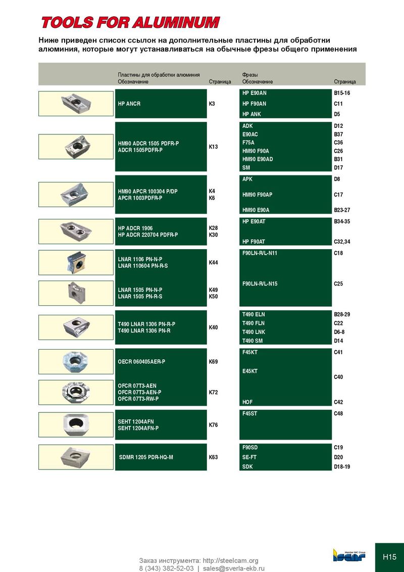 TOOLS FOR ALUMINUM Ниже приведен список ссылок на дополнительные пластины для обработки алюминия, которые могут устанавливаться на обычные фрезы общего применения Пластины для обработки алюминия Фрезы Обозначение Страница Обозначение Страница HP E90AN B15-16 HP ANCR K3 HP F90AN C11 HP ANK D5 ADK D12 E90AC B37 HM90 ADCR 1505 PDFR-P F75A C36 K13 ADCR 1505PDFR-P HM90 F90A C26 HM90 E90AD B31 SM D17 APK D8 HM90 APCR 100304 P/DP K4 HM90 F90AP C17 APCR 1003PDFR-P K6 HM90 E90A B23-27 HP E90AT B34-35 HP ADCR 1906 K28 HP ADCR 220704 PDFR-P K30 HP F90AT C32,34 F90LN-R/L-N11 C18 LNAR 1106 PN-N-P K44 LNAR 110604 PN-R-S F90LN-R/L-N15 C25 LNAR 1505 PN-N-P K49 LNAR 1505 PN-R-S K50 T490 ELN B28-29 T490 LNAR 1306 PN-R-P T490 FLN C22 K40 T490 LNAR 1306 PN-R T490 LNK D6-8 T490 SM D14 F45KT C41 OECR 060405AER-P K69 E45KT C40 OFCR 07T3-AEN OFCR 07T3-AEN-P K72 OFCR 07T3-RW-P HOF C42 F45ST C48 SEHT 1204AFN K76 SEHT 1204AFN-P F90SD C19 SDMR 1205 PDR-HQ-M K63 SE-FT D20 SDK D18-19 H15 Заказ инструмента: http://steelcam.org 8 (343) 382-52-03 | sales@sverla-ekb.ru