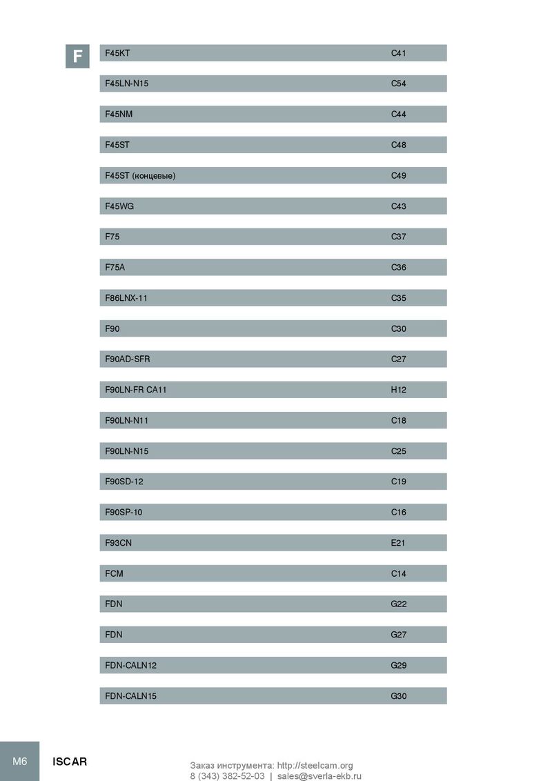 F45KT C41 F F45LN-N15 C54 F45NM C44 F45ST C48 F45ST (концевые) C49 F45WG C43 F75 C37 F75A C36 F86LNX-11 C35 F90 C30 F90AD-SFR C27 F90LN-FR CA11 H12 F90LN-N11 C18 F90LN-N15 C25 F90SD-12 C19 F90SP-10 C16 F93CN E21 FCM C14 FDN G22 FDN G27 FDN-CALN12 G29 FDN-CALN15 G30 M6 ISCAR Заказ инструмента: http://steelcam.org 8 (343) 382-52-03 | sales@sverla-ekb.ru