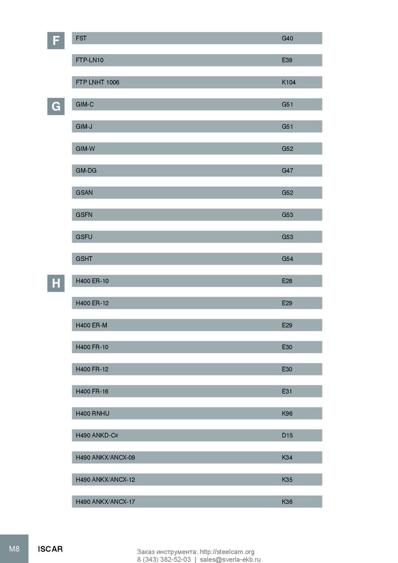 FST G40 F FTP-LN10 E39 FTP LNHT 1006 K104 GIM-C G51 G GIM-J G51 GIM-W G52 GM-DG G47 GSAN G52 GSFN G53 GSFU G53 GSHT G54 H400 ER-10 E28 H H400 ER-12 E29 H400 ER-M E29 H400 FR-10 E30 H400 FR-12 E30 H400 FR-16 E31 H400 RNHU K96 H490 ANKD-C# D15 H490 ANKX/ANCX-09 K34 H490 ANKX/ANCX-12 K35 H490 ANKX/ANCX-17 K36 M8 ISCAR Заказ инструмента: http://steelcam.org 8 (343) 382-52-03 | sales@sverla-ekb.ru