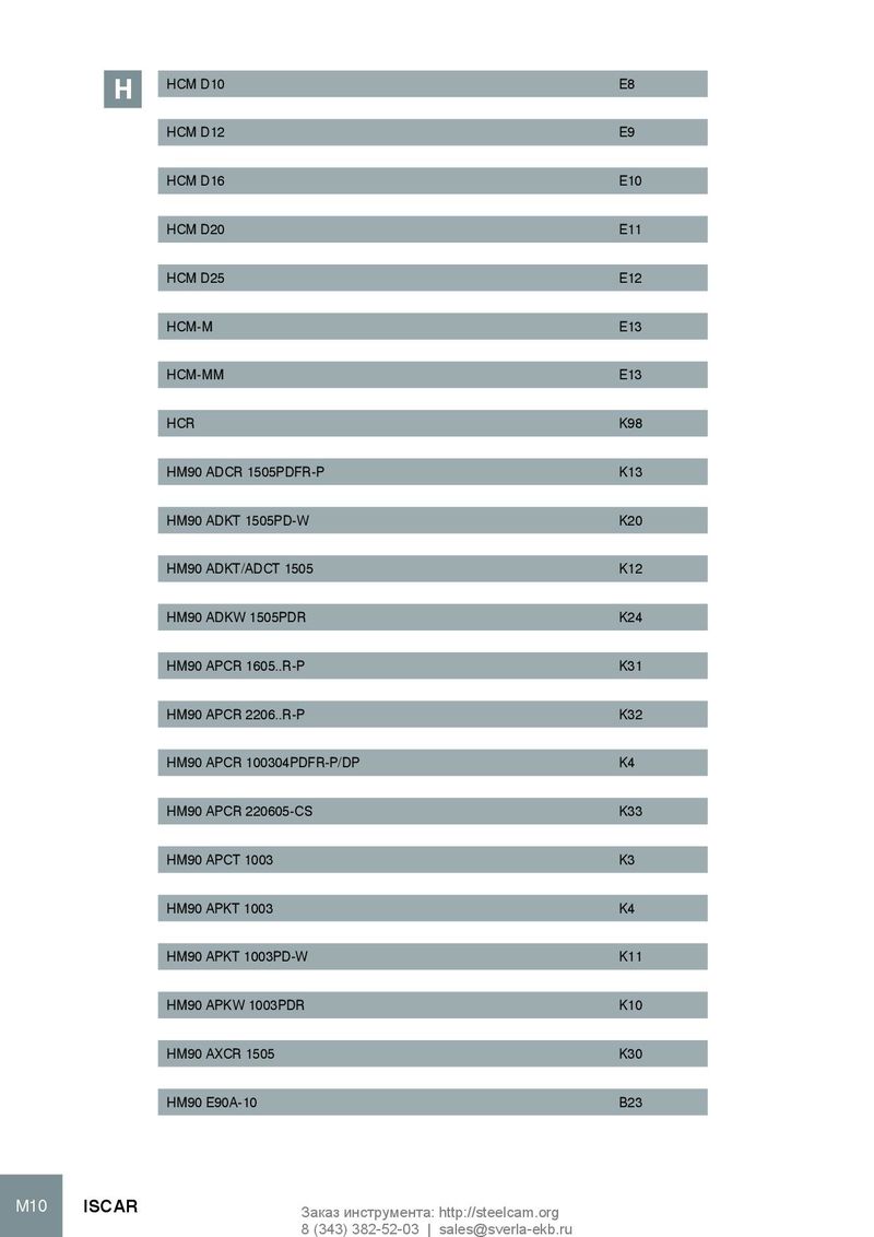 HCM D10 E8 H HCM D12 E9 HCM D16 E10 HCM D20 E11 HCM D25 E12 HCM-M E13 HCM-MM E13 HCR K98 HM90 ADCR 1505PDFR-P K13 HM90 ADKT 1505PD-W K20 HM90 ADKT/ADCT 1505 K12 HM90 ADKW 1505PDR K24 HM90 APCR 1605..R-P K31 HM90 APCR 2206..R-P K32 HM90 APCR 100304PDFR-P/DP K4 HM90 APCR 220605-CS K33 HM90 APCT 1003 K3 HM90 APKT 1003 K4 HM90 APKT 1003PD-W K11 HM90 APKW 1003PDR K10 HM90 AXCR 1505 K30 HM90 E90A-10 B23 M10 ISCAR Заказ инструмента: http://steelcam.org 8 (343) 382-52-03 | sales@sverla-ekb.ru