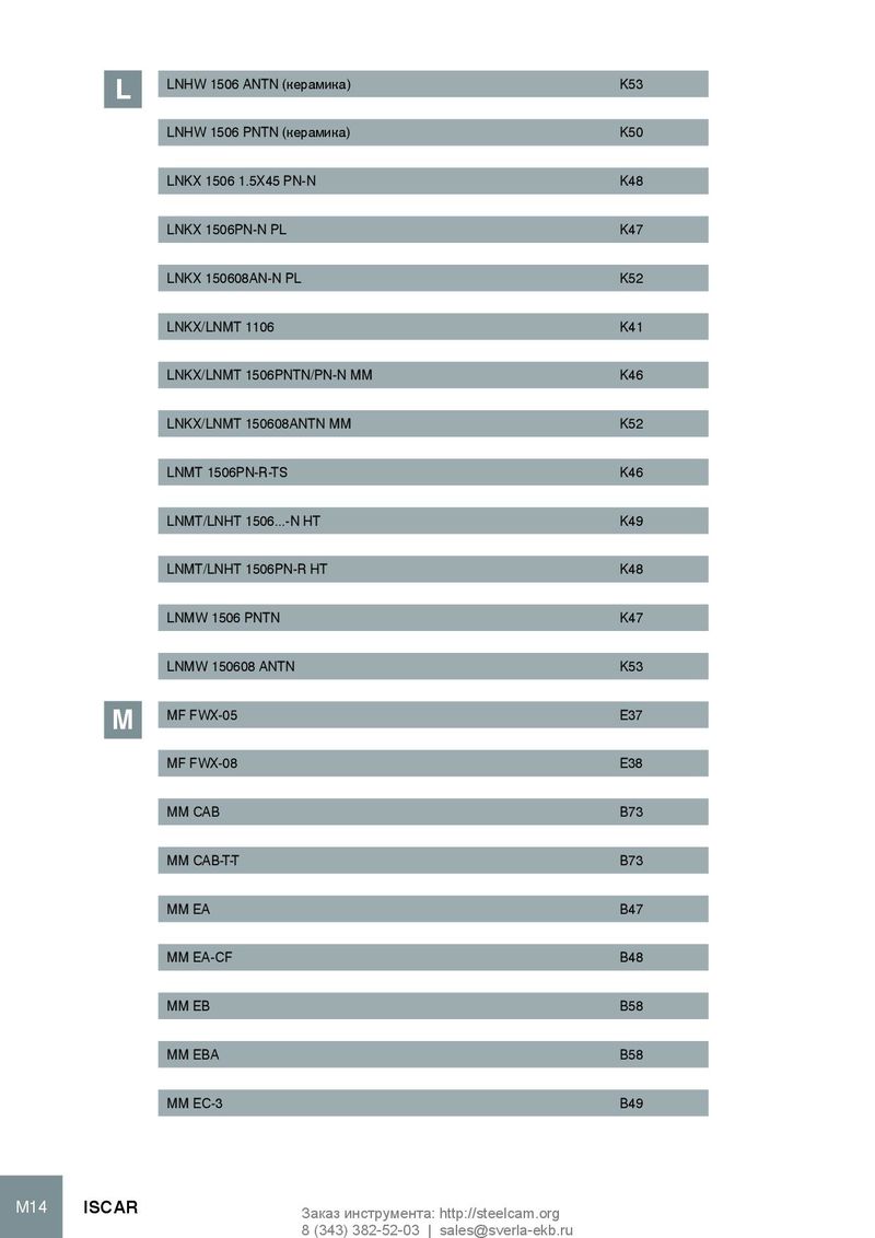 LNHW 1506 ANTN (керамика) K53 L LNHW 1506 PNTN (керамика) K50 LNKX 1506 1.5X45 PN-N K48 LNKX 1506PN-N PL K47 LNKX 150608AN-N PL K52 LNKX/LNMT 1106 K41 LNKX/LNMT 1506PNTN/PN-N MM K46 LNKX/LNMT 150608ANTN MM K52 LNMT 1506PN-R-TS K46 LNMT/LNHT 1506...-N HT K49 LNMT/LNHT 1506PN-R HT K48 LNMW 1506 PNTN K47 LNMW 150608 ANTN K53 MF FWX-05 E37 M MF FWX-08 E38 MM CAB B73 MM CAB-T-T B73 MM EA B47 MM EA-CF B48 MM EB B58 MM EBA B58 MM EC-3 B49 M14 ISCAR Заказ инструмента: http://steelcam.org 8 (343) 382-52-03 | sales@sverla-ekb.ru