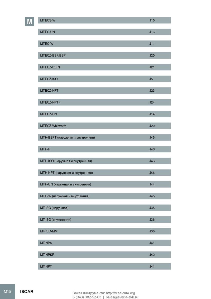 MTECS-W J10 M MTEC-UN J13 MTEC-W J11 MTECZ-BSF/BSP J20 MTECZ-BSPT J21 MTECZ-ISO J5 MTECZ-NPT J23 MTECZ-NPTF J24 MTECZ-UN J14 MTECZ-Whitworth J20 MTH-BSPT (наружная и внутренняя) J45 MTH-F J46 MTH-ISO (наружная и внутренняя) J43 MTH-NPT (наружная и внутренняя) J46 MTH-UN (наружная и внутренняя) J44 MTH-W (наружная и внутренняя) J45 MT-ISO (наружная) J35 MT-ISO (внутренняя) J36 MT-ISO-MM J30 MT-NPS J41 MT-NPSF J42 MT-NPT J41 M18 ISCAR Заказ инструмента: http://steelcam.org 8 (343) 382-52-03 | sales@sverla-ekb.ru