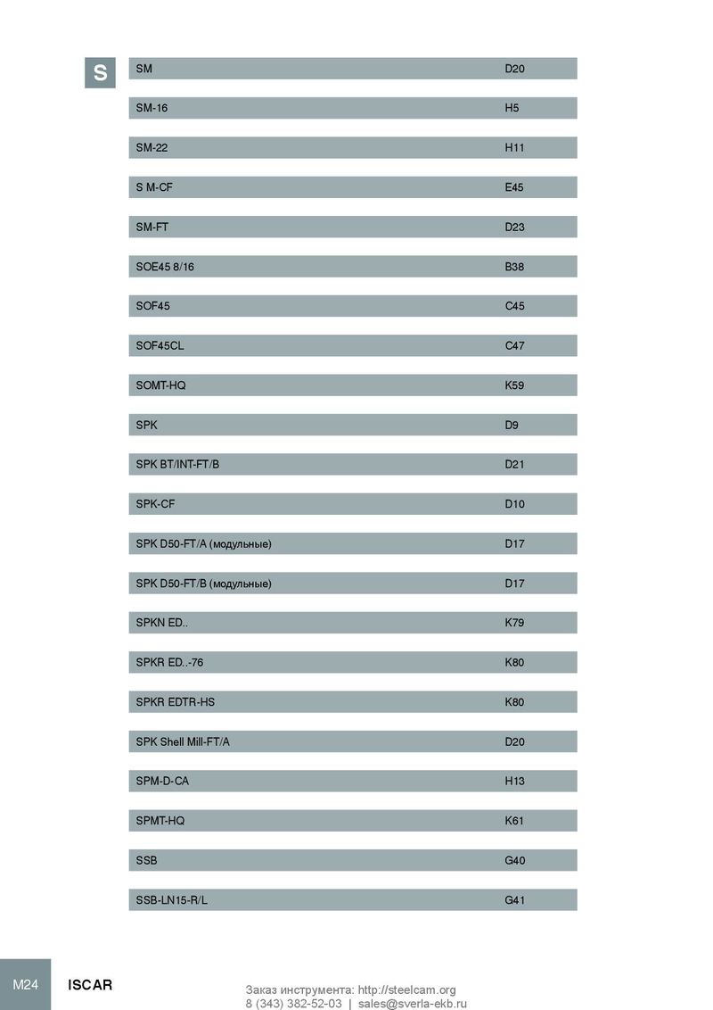 SM D20 S SM-16 H5 SM-22 H11 S M-CF E45 SM-FT D23 SOE45 8/16 B38 SOF45 C45 SOF45CL C47 SOMT-HQ K59 SPK D9 SPK BT/INT-FT/B D21 SPK-CF D10 SPK D50-FT/A (модульные) D17 SPK D50-FT/B (модульные) D17 SPKN ED.. K79 SPKR ED..-76 K80 SPKR EDTR-HS K80 SPK Shell Mill-FT/A D20 SPM-D-CA H13 SPMT-HQ K61 SSB G40 SSB-LN15-R/L G41 M24 ISCAR Заказ инструмента: http://steelcam.org 8 (343) 382-52-03 | sales@sverla-ekb.ru