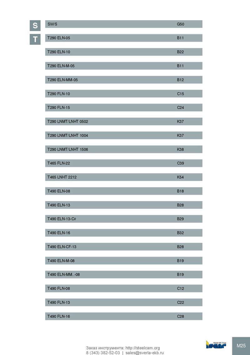 SW/S G50 S T290 ELN-05 B11 T T290 ELN-10 B22 T290 ELN-M-05 B11 T290 ELN-MM-05 B12 T290 FLN-10 C15 T290 FLN-15 C24 T290 LNMT/LNHT 0502 K37 T290 LNMT/LNHT 1004 K37 T290 LNMT/LNHT 1506 K38 T465 FLN-22 C39 T465 LNHT 2212 K54 T490 ELN-08 B18 T490 ELN-13 B28 T490 ELN-13-C# B29 T490 ELN-16 B32 T490 ELN-CF-13 B28 T490 ELN-M-08 B19 T490 ELN-MM..-08 B19 T490 FLN-08 C12 T490 FLN-13 C22 T490 FLN-16 C28 M25 Заказ инструмента: http://steelcam.org 8 (343) 382-52-03 | sales@sverla-ekb.ru