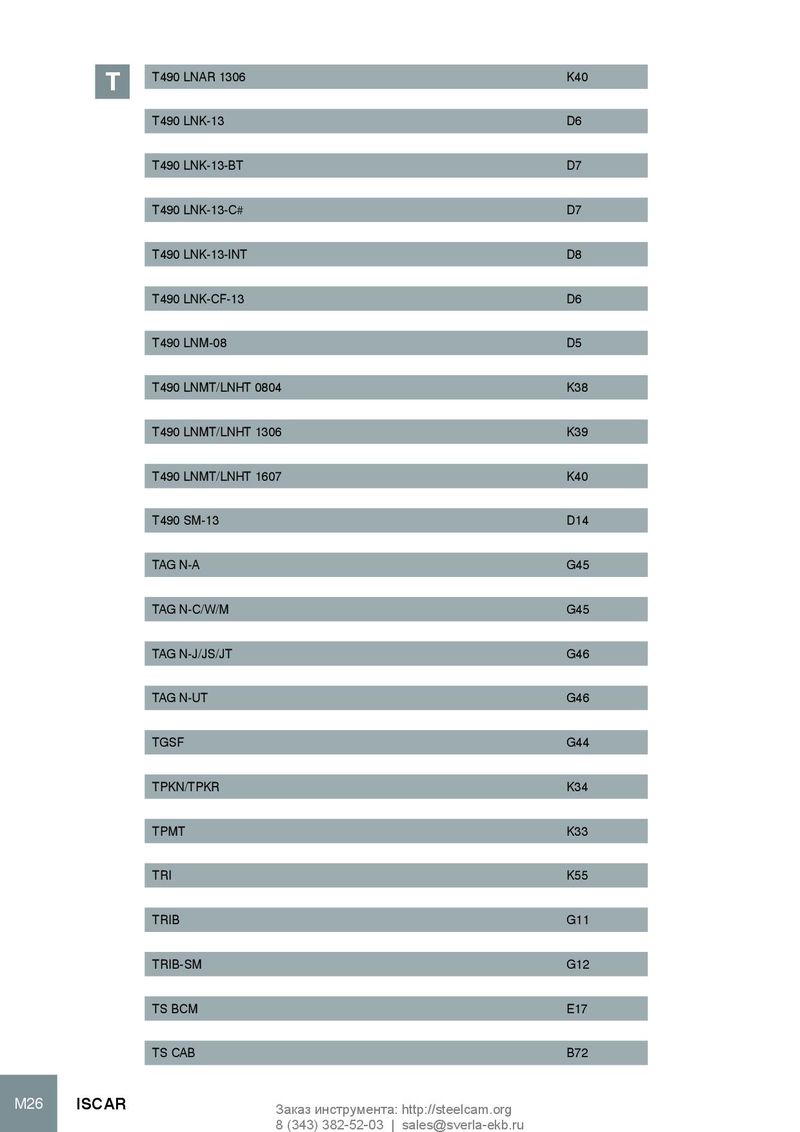 T490 LNAR 1306 K40 T T490 LNK-13 D6 T490 LNK-13-BT D7 T490 LNK-13-C# D7 T490 LNK-13-INT D8 T490 LNK-CF-13 D6 T490 LNM-08 D5 T490 LNMT/LNHT 0804 K38 T490 LNMT/LNHT 1306 K39 T490 LNMT/LNHT 1607 K40 T490 SM-13 D14 TAG N-A G45 TAG N-C/W/M G45 TAG N-J/JS/JT G46 TAG N-UT G46 TGSF G44 TPKN/TPKR K34 TPMT K33 TRI K55 TRIB G11 TRIB-SM G12 TS BCM E17 TS CAB B72 M26 ISCAR Заказ инструмента: http://steelcam.org 8 (343) 382-52-03 | sales@sverla-ekb.ru