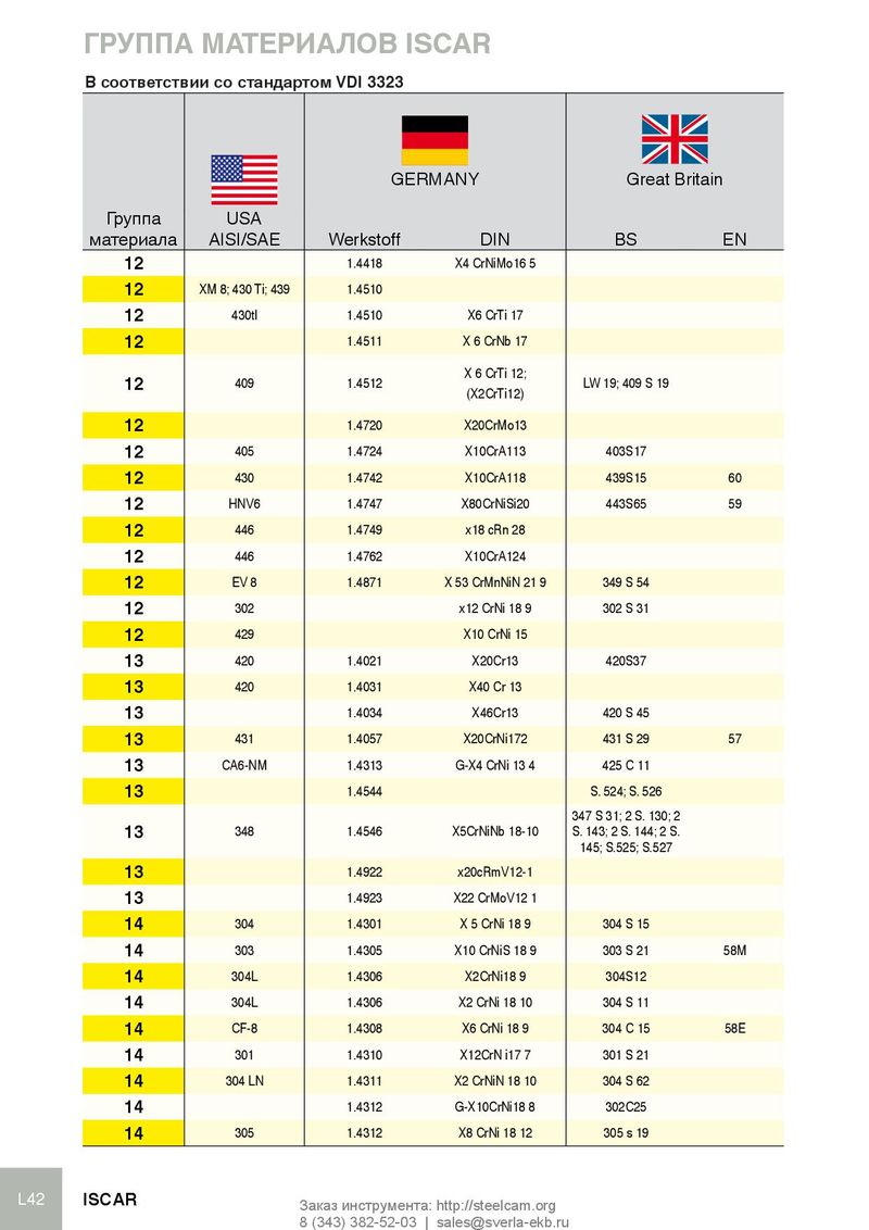 ГРУППА МАТЕРИАЛОВ ISCAR В соответствии со стандартом VDI 3323 GERMANY Great Britain Группа USA France Sweden Italy Spain Japan Russia материала AISI/SAE Werkstoff DIN BS EN AFNOR SS UNI UNE JIS ГОСТ 12 1.4418 X4 CrNiMo16 5 Z6CND16-04-01 2387 12 XM 8; 430 Ti; 439 1.4510 Z 4 CT 17 X 6 CrTi 17 F.3115 -X 5 CrTi 17 SUS 430 LX 08 Ch17T 12 430tI 1.4510 X6 CrTi 17 Z 4 CT 17 08Ch17T 12 1.4511 X 6 CrNb 17 Z 4 CNb 17 X 6 CrNb 17 F.3122-X 5 CrNb 17 SUS 430 LK X 6 CrTi 12; 12 409 1.4512 LW 19; 409 S 19 Z 3 CT 12 X 6 CrTi 12 SUH 409 (X2CrTi12) 12 1.4720 X20CrMo13 12 405 1.4724 X10CrA113 403S17 Z10C13 X10CrA112 F.311 10Ch13SJu 12 430 1.4742 X10CrA118 439S15 60 Z10CAS18 X8Cr17 F.3113 SUS430 15Ch13SJu 12 HNV6 1.4747 X80CrNiSi20 443S65 59 Z80CSN20.02 X80CrSiNi20 F.320B SUH4 12 446 1.4749 x18 cRn 28 12 446 1.4762 X10CrA124 Z10CAS24 2322 X16Cr26 SUH446 12 EV 8 1.4871 X 53 CrMnNiN 21 9 349 S 54 Z 52 CMN 21.09 X53CrMnNiN21 9 SUH35, SUH36 55Ch20G9AN4 12 302 x12 CrNi 18 9 302 S 31 Z 10 CN 18-09 2330 12 429 X10 CrNi 15 13 420 1.4021 X20Cr13 420S37 Z 20 C 13 2303 14210 20Ch13 13 420 1.4031 X40 Cr 13 Z 40 C 14 2304 40Ch13 13 1.4034 X46Cr13 420 S 45 Z40 C 14 X40Cr14 F.3405 SUS420J2 13 431 1.4057 X20CrNi172 431 S 29 57 Z 15 CN 16.02 2321 X16CrNi16 F.3427 SUS431 20Ch17N2 13 CA6-NM 1.4313 G-X4 CrNi 13 4 425 C 11 Z 4 CND 13-04 M 2385 (G)X6CrNi304 SCS5 13 1.4544 S. 524; S. 526 X 6 CrNiTi 18 11 08Ch 18N12T 347 S 31; 2 S. 130; 2 13 348 1.4546 X5CrNiNb 18-10 S. 143; 2 S. 144; 2 S. X 6 CrNiNb 18 11 145; S.525; S.527 13 1.4922 x20cRmV12-1 2317 x20cRmOnI 12 01 13 1.4923 X22 CrMoV12 1 14 304 1.4301 X 5 CrNi 18 9 304 S 15 Z 5 CN 18.09 2332; 2333 08Ch18N10 14 303 1.4305 X10 CrNiS 18 9 303 S 21 58M Z 8 CNF 18-09 2346 X10CrNiS18.09 F.3508 SUS303 30Ch18N11 14 304L 1.4306 X2CrNi18 9 304S12 Z2CrNi18 10 2352 x2cRnI18 11 F.3503 SCS19 14 304L 1.4306 X2 CrNi 18 10 304 S 11 Z 3 CN 19-11 2352 X2CrNi18 11 14 CF-8 1.4308 X6 CrNi 18 9 304 C 15 58E Z 6 CN 18-10 M 2333 SUS304L 14 301 1.4310 X12CrN i17 7 301 S 21 Z 12 CN 17.07 2331 X2CrNi18 07 F.3517 14 304 LN 1.4311 X2 CrNiN 18 10 304 S 62 Z 2 CN18.10 2371 X2CrNiN18 10 SUS304LN 14 1.4312 G-X10CrNi18 8 302C25 Z10CN18.9M 10Ch18N9L 14 305 1.4312 X8 CrNi 18 12 305 s 19 10Ch18N9L L42 ISCAR Заказ инструмента: http://steelcam.org 8 (343) 382-52-03 | sales@sverla-ekb.ru