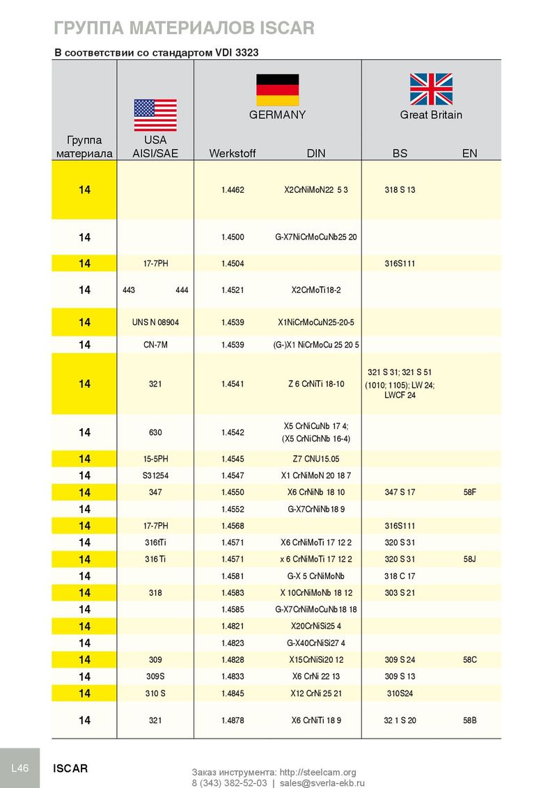 ГРУППА МАТЕРИАЛОВ ISCAR В соответствии со стандартом VDI 3323 GERMANY Great Britain Группа USA France Sweden Italy Spain Japan Russia материала AISI/SAE Werkstoff DIN BS EN AFNOR SS UNI UNE JIS ГОСТ Z 3 CND 22-05 Az; (Z 2 CND 24 -08 14 1.4462 X2CrNiMoN22 5 3 318 S 13 Az); 2377 SUS 329 J3L (Z 3 CND 25-06-03 Az) 14 1.4500 G-X7NiCrMoCuNb25 20 23NCDU25.20M 14 17-7PH 1.4504 316S111 Z8CNA17-07 X2CrNiMo1712 F.3123-X 2 14 443 444 1.4521 X2CrMoTi18-2 2326 SUS 444 CrMoTiNb 18 2 14 UNS N 08904 1.4539 X1NiCrMoCuN25-20-5 Z 2 NCDU 25-20 2562 14 CN-7M 1.4539 (G-)X1 NiCrMoCu 25 20 5 Z1 NCDU 25-02 M 2564 06Ch18N10T; 321 S 31; 321 S 51 F.3523 - X 6 CrNiTi 08Ch18N10T; 14 321 1.4541 Z 6 CrNiTi 18-10 (1010; 1105); LW 24; Z 6 CNT 18-10 2337 X 6 CrNiTi 18 11 SUS 321 18 10 09Ch18N10T; LWCF 24 12Ch18N10T X5 CrNiCuNb 17 4; Z 7 CNU 15-05; Z 7 14 630 1.4542 SCS 24; SUS 630 (X5 CrNiChNb 16-4) CNU 17-04 14 15-5PH 1.4545 Z7 CNU15.05 14 S31254 1.4547 X1 CrNiMoN 20 18 7 2378 14 347 1.4550 X6 CrNiNb 18 10 347 S 17 58F Z 6 CNNb 18.10 2338 X6CrNiNb18 11 F.3552 SUS347 08Ch18N12B 14 1.4552 G-X7CrNiNb18 9 Z4CNNb19.10M 14 17-7PH 1.4568 316S111 Z8CNA17-07 X2CrNiMo1712 09Ch17NJu1 14 316tTi 1.4571 X6 CrNiMoTi 17 12 2 320 S 31 Z 6 CNDT 17-12002 2350 10Ch17N13M2T 14 316 Ti 1.4571 x 6 CrNiMoTi 17 12 2 320 S 31 58J Z 6 NDT 17.12 2350 X6CrNiMoTi17 12 F.3535 10Ch17N13M2T 14 1.4581 G-X 5 CrNiMoNb 318 C 17 Z 4 CNDNb 18.12 M 14 318 1.4583 X 10CrNiMoNb 18 12 303 S 21 Z15CNS20.12 x15cRnIsI2 12 14 1.4585 G-X7CrNiMoCuNb18 18 X6CrNiMoTi17 12 14 1.4821 X20CrNiSi25 4 Z20CNS25.04 14 1.4823 G-X40CrNiSi27 4 14 309 1.4828 X15CrNiSi20 12 309 S 24 58C Z15CNS20.12 F.8414 SCS17 20Ch20N14S2 14 309S 1.4833 X6 CrNi 22 13 309 S 13 Z 15 CN 24-13 14 310 S 1.4845 X12 CrNi 25 21 310S24 Z 12 CN 25-20 2361 X6CrNi25 20 F.331 SUH310 20Ch23N18 Z 6 CNT 18-12 14 321 1.4878 X6 CrNiTi 18 9 32 1 S 20 58B 2337 X6CrNiTi18 11 F.3553 SUS321 (B) L46 ISCAR Заказ инструмента: http://steelcam.org 8 (343) 382-52-03 | sales@sverla-ekb.ru