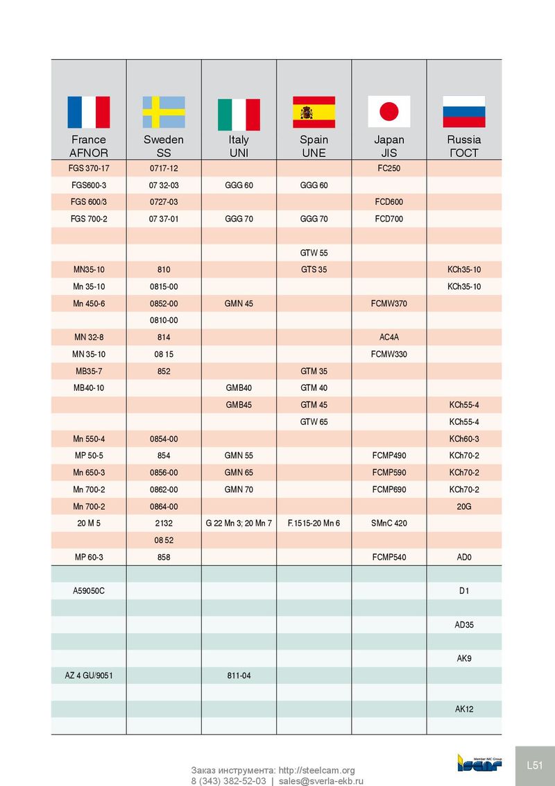 GERMANY Great Britain Группа USA France Sweden Italy Spain Japan Russia материала AISI/SAE Werkstoff DIN BS EN AFNOR SS UNI UNE JIS ГОСТ 17 GGG 40.3 SNG 370/17 FGS 370-17 0717-12 FC250 18 0.7060 GGG60 SNG600/3 FGS600-3 07 32-03 GGG 60 GGG 60 18 80/55/06 0.7060 GGG-60 600/3 FGS 600/3 0727-03 FCD600 18 100/70/03 0.7070 GGG-70 SNG700/2 FGS 700-2 07 37-01 GGG 70 GGG 70 FCD700 18 A48 40 B 19 0.8055 GTW55 GTW 55 19 32510 0.8135 GTS-35-10 B 340/12 MN35-10 810 GTS 35 KCh35-10 19 A47-32510 0.8135 GTS-35-10 B 340/2 Mn 35-10 0815-00 KCh35-10 19 A220-40010 0.8145 GTS-45-06 P 440/7 Mn 450-6 0852-00 GMN 45 FCMW370 19 GTS-35 B 340/12 0810-00 19 8 290/6 MN 32-8 814 AC4A 19 32510 GTS-35 B340/12 MN 35-10 08 15 FCMW330 20 0.8035 GTM-35 W340/3 MB35-7 852 GTM 35 20 0.8040 GTW-40 W410/4 MB40-10 GMB40 GTM 40 20 0.8045 GMB45 GTM 45 KCh55-4 20 0.8065 GTMW-65 GTW 65 KCh55-4 20 A220-50005 0.8155 GTS-55-04 P 510/4 Mn 550-4 0854-00 KCh60-3 20 50005 0.8155 GTS-55-04 P510/4 MP 50-5 854 GMN 55 FCMP490 KCh70-2 20 70003 0.8165 GTS-65-02 P 570/3 Mn 650-3 0856-00 GMN 65 FCMP590 KCh70-2 20 90001 0.8170 GTS-70-02 P 690/2 Mn 700-2 0862-00 GMN 70 FCMP690 KCh70-2 20 A220-90001 0.8170 GTS-70-02 Mn 700-2 0864-00 20G 20 1022; 1518 1.1133 20Mn5 120 M 19 20 M 5 2132 G 22 Mn 3; 20 Mn 7 F.1515-20 Mn 6 SMnC 420 20 400 10 GTS-45 P440/7 08 52 20 70003 GTS-65 P 570/3 MP 60-3 858 FCMP540 AD0 21 Al99 3.0205 21 1000 3.0255 AI99.5 L31; L34; L36 A59050C D1 21 3.3315 AIMg1 22 3.1325 AlCuMg 1 AD35 22 3.1655 AICuSiPb 22 3.2315 AlMgSi1 AK9 22 7050 3.4345 AIZnMgCuO,5 L 86 AZ 4 GU/9051 811-04 22 3.437 AlZnMgCu 1,5 23 3.2381 G-AISi 10 Mg AK12 23 3.2382 GD-AISi10Mg L51 Заказ инструмента: http://steelcam.org 8 (343) 382-52-03 | sales@sverla-ekb.ru