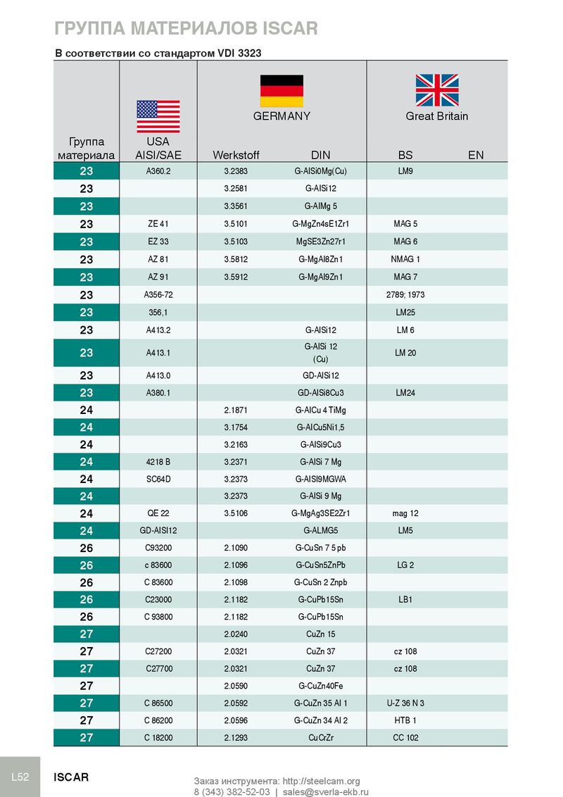 ГРУППА МАТЕРИАЛОВ ISCAR В соответствии со стандартом VDI 3323 GERMANY Great Britain Группа USA France Sweden Italy Spain Japan Russia материала AISI/SAE Werkstoff DIN BS EN AFNOR SS UNI UNE JIS ГОСТ 23 A360.2 3.2383 G-AISi0Mg(Cu) LM9 4253 23 3.2581 G-AISi12 23 3.3561 G-AIMg 5 23 ZE 41 3.5101 G-MgZn4sE1Zr1 MAG 5 23 EZ 33 3.5103 MgSE3Zn27r1 MAG 6 G-TR3Z2 23 AZ 81 3.5812 G-MgAI8Zn1 NMAG 1 23 AZ 91 3.5912 G-MgAI9Zn1 MAG 7 23 A356-72 2789; 1973 NF A32-201 23 356,1 LM25 4244 A5052 AK7 23 A413.2 G-AlSi12 LM 6 4261 G-AlSi 12 23 A413.1 LM 20 4260 ADC12 AK12 (Cu) 23 A413.0 GD-AlSi12 4247 A6061 23 A380.1 GD-AlSi8Cu3 LM24 4250 A7075 24 2.1871 G-AICu 4 TiMg 24 3.1754 G-AICu5Ni1,5 24 3.2163 G-AISi9Cu3 VAL 8 24 4218 B 3.2371 G-AISi 7 Mg AK8 24 SC64D 3.2373 G-AISI9MGWA A-S7G 4251 C4BS AK9 24 3.2373 G-AISi 9 Mg 24 QE 22 3.5106 G-MgAg3SE2Zr1 mag 12 24 GD-AISI12 G-ALMG5 LM5 A-SU12 4252 26 C93200 2.1090 G-CuSn 7 5 pb U-E 7 Z 5 pb 4 26 c 83600 2.1096 G-CuSn5ZnPb LG 2 26 C 83600 2.1098 G-CuSn 2 Znpb 26 C23000 2.1182 G-CuPb15Sn LB1 U-pb 15 E 8 26 C 93800 2.1182 G-CuPb15Sn Uu-PB 15e 8 27 2.0240 CuZn 15 27 C27200 2.0321 CuZn 37 cz 108 CuZn 36, CuZn 37 C 2700 L 63 27 C27700 2.0321 CuZn 37 cz 108 CuZn 36, CuZn 37 C2720 L 63 27 2.0590 G-CuZn40Fe 27 C 86500 2.0592 G-CuZn 35 AI 1 U-Z 36 N 3 HTB 1 27 C 86200 2.0596 G-CuZn 34 AI 2 HTB 1 U-Z 36 N 3 LTs23AD; ZMts 27 C 18200 2.1293 CuCrZr CC 102 U-Cr 0.8 Zr L52 ISCAR Заказ инструмента: http://steelcam.org 8 (343) 382-52-03 | sales@sverla-ekb.ru
