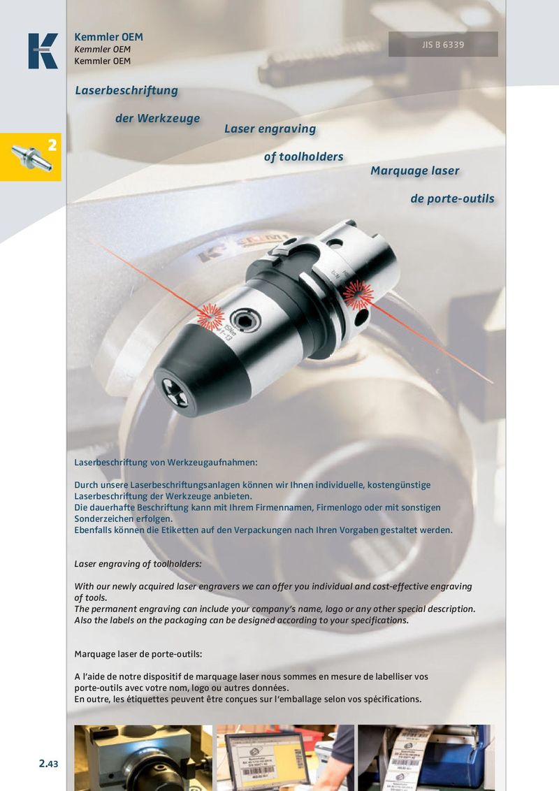Kemmler OEM JIS B 6339 JIS B 6339 DIN 69871 Kemmler OEM Kemmler OEM Laserbeschriftung der Werkzeuge Laser engraving 2 of toolholders Marquage laser de porte-outils Laserbeschriftung von Werkzeugaufnahmen: Durch unsere Laserbeschriftungsanlagen können wir Ihnen individuelle, kostengünstige Laserbeschriftung der Werkzeuge anbieten. Die dauerhafte Beschriftung kann mit Ihrem Firmennamen, Firmenlogo oder mit sonstigen Sonderzeichen erfolgen. Ebenfalls können die Etiketten auf den Verpackungen nach Ihren Vorgaben gestaltet werden. Laser engraving of toolholders: With our newly acquired laser engravers we can offer you individual and cost-effective engraving of tools. The permanent engraving can include your company’s name, logo or any other special description. Also the labels on the packaging can be designed according to your specifi cations. Marquage laser de porte-outils: A l’aide de notre dispositif de marquage laser nous sommes en mesure de labelliser vos porte-outils avec votre nom, logo ou autres données. En outre, les étiquettes peuvent être conçues sur l‘emballage selon vos spécifi cations. 2.43 KEMMLER KEMMLER