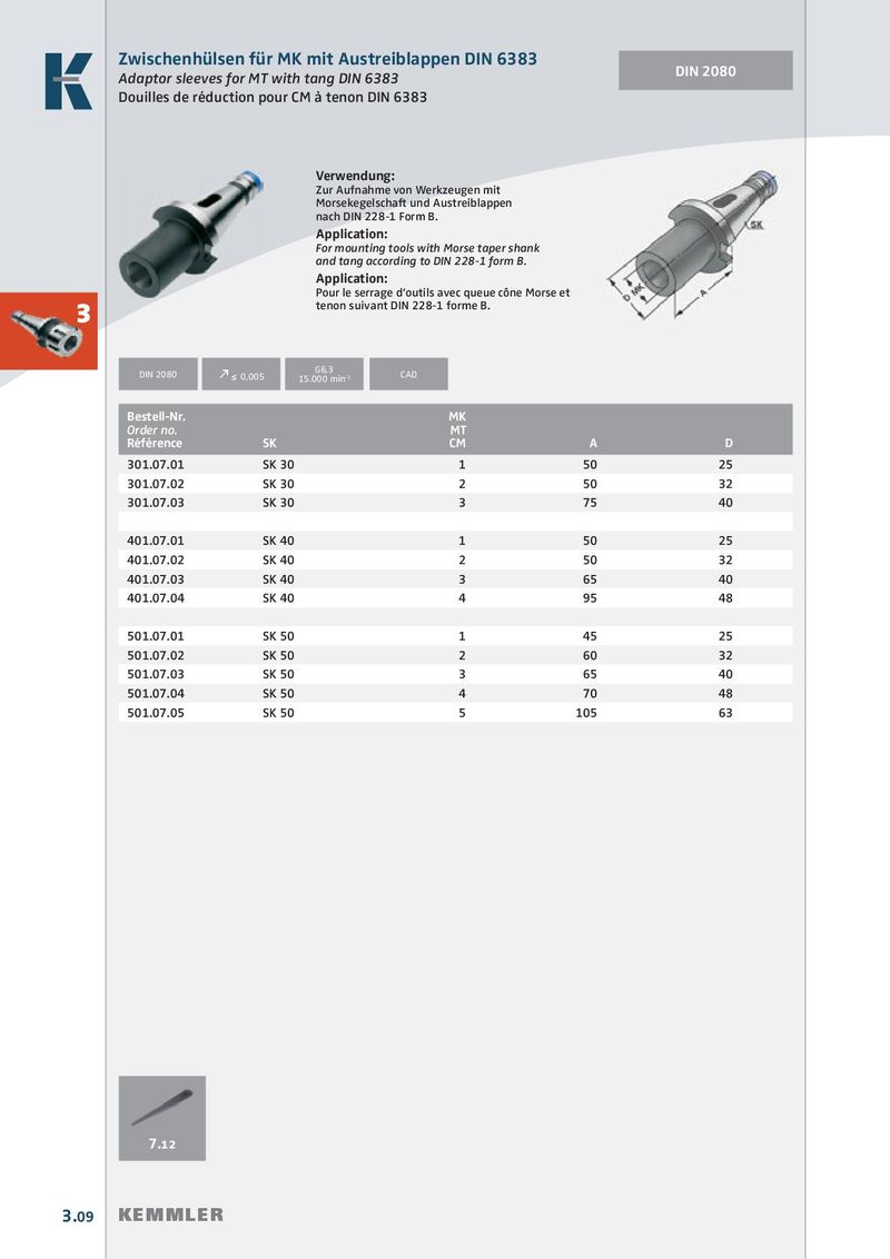 Zwischenhülsen für MK mit Austreiblappen DIN 6383 DIN 2080 Adaptor sleeves for MT with tang DIN 6383 Douilles de réduction pour CM à tenon DIN 6383 Verwendung: Zur Aufnahme von Werkzeugen mit Morsekegelschaft und Austreiblappen nach DIN 228-1 Form B. Application: For mounting tools with Morse taper shank and tang according to DIN 228-1 form B. Application: Pour le serrage d’outils avec queue cône Morse et tenon suivant DIN 228-1 forme B. 3 G6,3 DIN 2080 k ≤ 0,005 15.000 min -1 CAD Bestell-Nr. MK Order no. MT Référence SK CM A D 301.07.01 SK 30 1 50 25 301.07.02 SK 30 2 50 32 301.07.03 SK 30 3 75 40 401.07.01 SK 40 1 50 25 401.07.02 SK 40 2 50 32 401.07.03 SK 40 3 65 40 401.07.04 SK 40 4 95 48 501.07.01 SK 50 1 45 25 501.07.02 SK 50 2 60 32 501.07.03 SK 50 3 65 40 501.07.04 SK 50 4 70 48 501.07.05 SK 50 5 105 63 7.12 3.09 KEMMLER