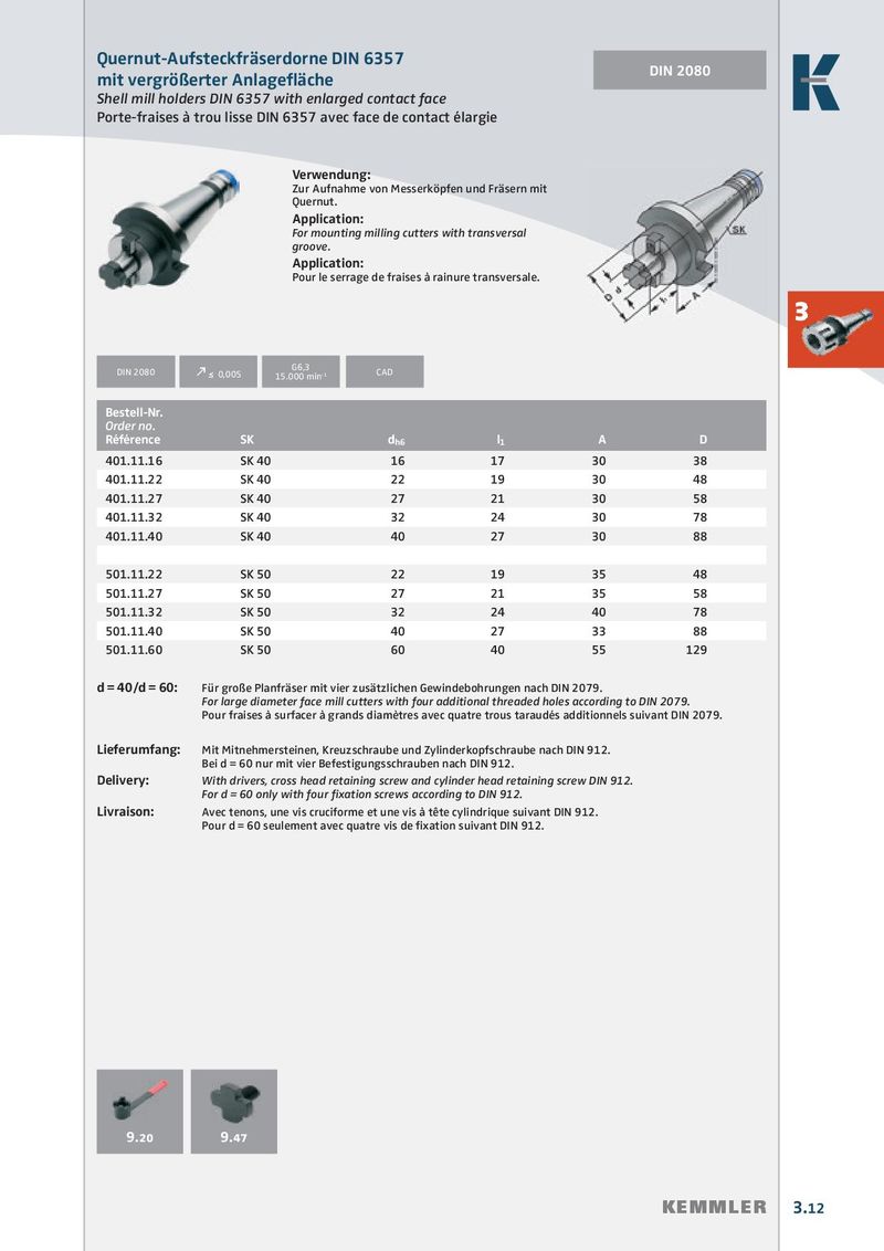 Quernut-Aufsteckfräserdorne DIN 6357 DIN 2080 mit vergrößerter Anlagefl äche Shell mill holders DIN 6357 with enlarged contact face Porte-fraises à trou lisse DIN 6357 avec face de contact élargie Verwendung: Zur Aufnahme von Messerköpfen und Fräsern mit Quernut. Application: For mounting milling cutters with transversal groove. Application: Pour le serrage de fraises à rainure transversale. 3 G6,3 DIN 2080 k ≤ 0,005 15.000 min -1 CAD Bestell-Nr. Order no. Référence SK d h6 l 1 A D 401.11.16 SK 40 16 17 30 38 401.11.22 SK 40 22 19 30 48 401.11.27 SK 40 27 21 30 58 401.11.32 SK 40 32 24 30 78 401.11.40 SK 40 40 27 30 88 501.11.22 SK 50 22 19 35 48 501.11.27 SK 50 27 21 35 58 501.11.32 SK 50 32 24 40 78 501.11.40 SK 50 40 27 33 88 501.11.60 SK 50 60 40 55 129 d = 40/d = 60: Für große Planfräser mit vier zusätzlichen Gewindebohrungen nach DIN 2079. For large diameter face mill cutters with four additional threaded holes according to DIN 2079. Pour fraises à surfacer à grands diamètres avec quatre trous taraudés additionnels suivant DIN 2079. Lieferumfang: Mit Mitnehmersteinen, Kreuzschraube und Zylinderkopfschraube nach DIN 912. Bei d = 60 nur mit vier Befestigungsschrauben nach DIN 912. Delivery: With drivers, cross head retaining screw and cylinder head retaining screw DIN 912. For d = 60 only with four fi xation screws according to DIN 912. Livraison: Avec tenons, une vis cruciforme et une vis à tête cylindrique suivant DIN 912. Pour d = 60 seulement avec quatre vis de fi xation suivant DIN 912. 9.20 9.47 KEMMLER 3.12