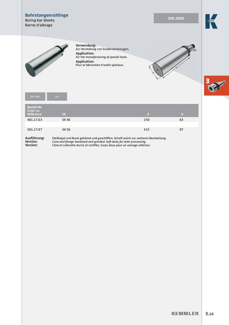 Bohrstangenrohlinge DIN 2080 Boring bar blanks Barres d’alésage Verwendung: Zur Herstellung von Sonderwerkzeugen. Application: For the manufacturing of special tools. Application: Pour la fabrication d’outils spéciaux. 3 DIN 2080 CAD Bestell-Nr. Order no. Référence SK A D 401.17.63 SK 40 250 63 501.17.97 SK 50 315 97 Ausführung: Steilkegel und Bund gehärtet und geschliffen. Schaft weich zur weiteren Bearbeitung. Version: Cone and fl ange hardened and grinded. Soft body for later processing. Version: Cône et collerette durcis et rectifi és. Corps doux pour un usinage ultérieur. KEMMLER 3.16