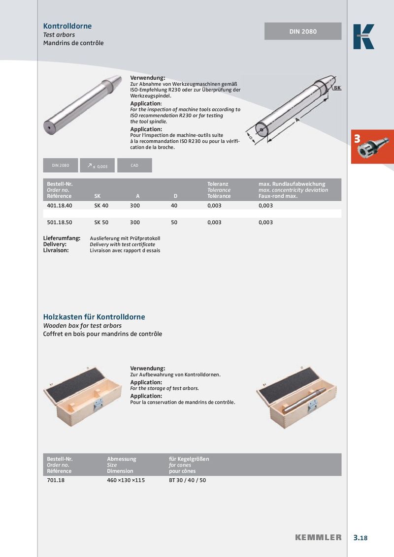 Kontrolldorne DIN 2080 Test arbors Mandrins de contrôle Verwendung: Zur Abnahme von Werkzeugmaschinen gemäß ISO-Empfehlung R230 oder zur Überprüfung der Werkzeugspindel. Application: For the inspection of machine tools according to ISO recommendation R230 or for testing the tool spindle. Application: Pour l‘inspection de machine-outils suite à la recommandation ISO R230 ou pour la vérifi - 3 cation de la broche. DIN 2080 k ≤ 0,003 CAD Bestell-Nr. Toleranz max. Rundlaufabweichung Order no. Tolerance max. concentricity deviation Référence SK A D Tolérance Faux-rond max. 401.18.40 SK 40 300 40 0,003 0,003 501.18.50 SK 50 300 50 0,003 0,003 Lieferumfang: Auslieferung mit Prüfprotokoll Delivery: Delivery with test certifi cate Livraison: Livraison avec rapport d essais Holzkasten für Kontrolldorne Wooden box for test arbors Coffret en bois pour mandrins de contrôle Verwendung: Zur Aufbewahrung von Kontrolldornen. Application: For the storage of test arbors. Application: Pour la conservation de mandrins de contrôle. Bestell-Nr. Abmessung für Kegelgrößen Order no. Size for cones Référence Dimension pour cônes 701.18 460 ×130 ×115 BT 30 / 40 / 50 KEMMLER 3.18