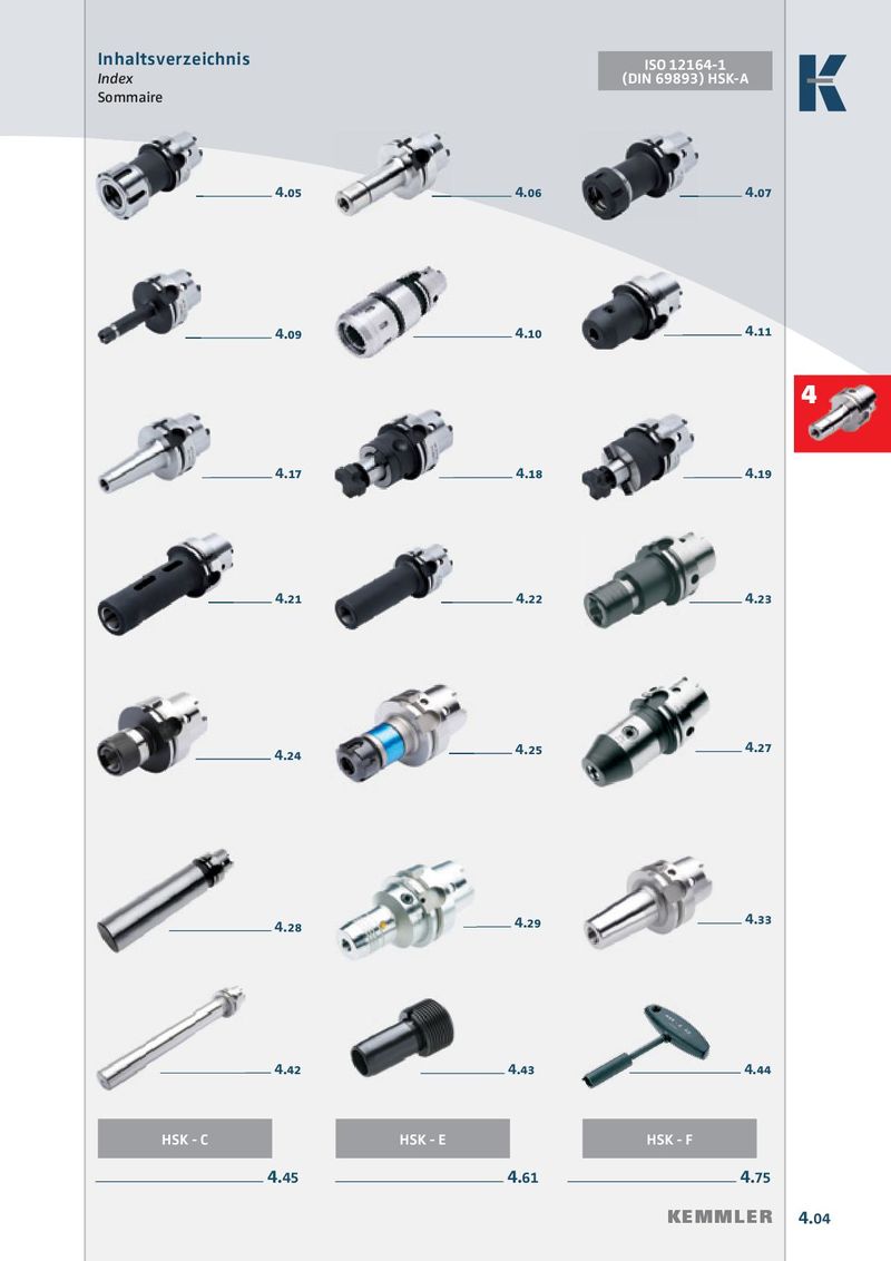 Inhaltsverzeichnis ISO 12164-1 Index (DIN 69893) HSK-A Sommaire 4.05 4.06 4.07 4.09 4.10 4.11 4 4.17 4.18 4.19 4.21 4.22 4.23 4.25 4.27 4.24 4.28 4.29 4.33 4.42 4.43 4.44 HSK - C HSK - E HSK - F 4.75 4.61 4.45 KEMMLER 4.04