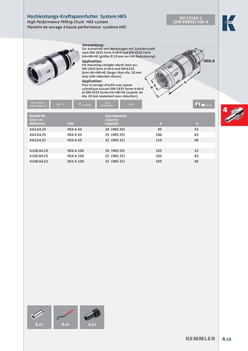 Hochleistungs-Kraftspannfutter System HKS ISO 12164-1 High Performance Milling Chuck HKS-system (DIN 69893) HSK-A Mandrin de serrage à haute performance système HKS Verwendung: Zur Aufnahme von Werkzeugen mit Zylinderschaft nach DIN 1835 Form A+B+E und DIN 6535 Form HA+HB+HE (größer Ø 20 mm nur mit Reduzierung). Application: For mounting straight-shank tools acc. DIN 1835 form A+B+E and DIN 6535 form HA+HB+HE (larger than dia. 20 mm only with reduction sleeve). Application: Pour le serrage d’outils avec queue cylindrique suivant DIN 1835 forme A+B+E et DIN 6535 forme HA+HB+HE (à partir de dia. 20 mm seulement avec réduction). ISO 12164-1 G6,3 HSK - A (DIN 69893-1) k ≤ 0,003 15.000 min -1 CAD Æ 13.04 4 Bestell-Nr. Spannbereich Order no. Capacity Référence HSK Capacité A D A63.64.20 HSK-A 63 20 (HKS 20) 95 53 A63.64.25 HSK-A 63 25 (HKS 25) 100 63 A63.64.32 HSK-A 63 32 (HKS 32) 110 68 A100.64.20 HSK-A 100 20 (HKS 20) 105 53 A100.64.25 HSK-A 100 25 (HKS 25) 105 63 A100.64.32 HSK-A 100 32 (HKS 32) 105 68 8.67 9.07 4.43 KEMMLER 4.10