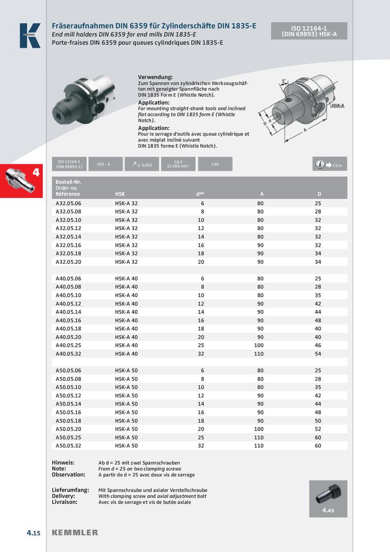 Fräseraufnahmen DIN 6359 für Zylinderschäfte DIN 1835-E ISO 12164-1 End mill holders DIN 6359 for end mills DIN 1835-E (DIN 69893) HSK-A Porte-fraises DIN 6359 pour queues cylindriques DIN 1835-E Verwendung: Zum Spannen von zylindrischen Werkzeugschäf- ten mit geneigter Spannfläche nach DIN 1835 Form E (Whistle Notch). Application: For mounting straight-shank tools and inclined fl at according to DIN 1835 form E (Whistle Notch). Application: Pour le serrage d’outils avec queue cylindrique et avec méplat incliné suivant DIN 1835 forme E (Whistle Notch). ISO 12164-1 G6,3 HSK - A (DIN 69893-1) k ≤ 0,003 15.000 min -1 CAD Æ 13.04 4 Bestell-Nr. Order no. Référence HSK d H4 A D A32.05.06 HSK-A 32 6 80 25 A32.05.08 HSK-A 32 8 80 28 A32.05.10 HSK-A 32 10 80 32 A32.05.12 HSK-A 32 12 80 32 A32.05.14 HSK-A 32 14 80 32 A32.05.16 HSK-A 32 16 90 32 A32.05.18 HSK-A 32 18 90 34 A32.05.20 HSK-A 32 20 90 34 A40.05.06 HSK-A 40 6 80 25 A40.05.08 HSK-A 40 8 80 28 A40.05.10 HSK-A 40 10 80 35 A40.05.12 HSK-A 40 12 90 42 A40.05.14 HSK-A 40 14 90 44 A40.05.16 HSK-A 40 16 90 48 A40.05.18 HSK-A 40 18 90 40 A40.05.20 HSK-A 40 20 90 40 A40.05.25 HSK-A 40 25 100 46 A40.05.32 HSK-A 40 32 110 54 A50.05.06 HSK-A 50 6 80 25 A50.05.08 HSK-A 50 8 80 28 A50.05.10 HSK-A 50 10 80 35 A50.05.12 HSK-A 50 12 90 42 A50.05.14 HSK-A 50 14 90 44 A50.05.16 HSK-A 50 16 90 48 A50.05.18 HSK-A 50 18 90 50 A50.05.20 HSK-A 50 20 100 52 A50.05.25 HSK-A 50 25 110 60 A50.05.32 HSK-A 50 32 110 60 Hinweis: Ab d = 25 mit zwei Spannschrauben Note: From d = 25 on two clamping screws Observation: A partir de d = 25 avec deux vis de serrage Lieferumfang: Mit Spannschraube und axialer Verstellschraube Delivery: With clamping screw and axial adjustment bolt Livraison: Avec vis de serrage et vis de butée axiale 4.43 4.15 KEMMLER