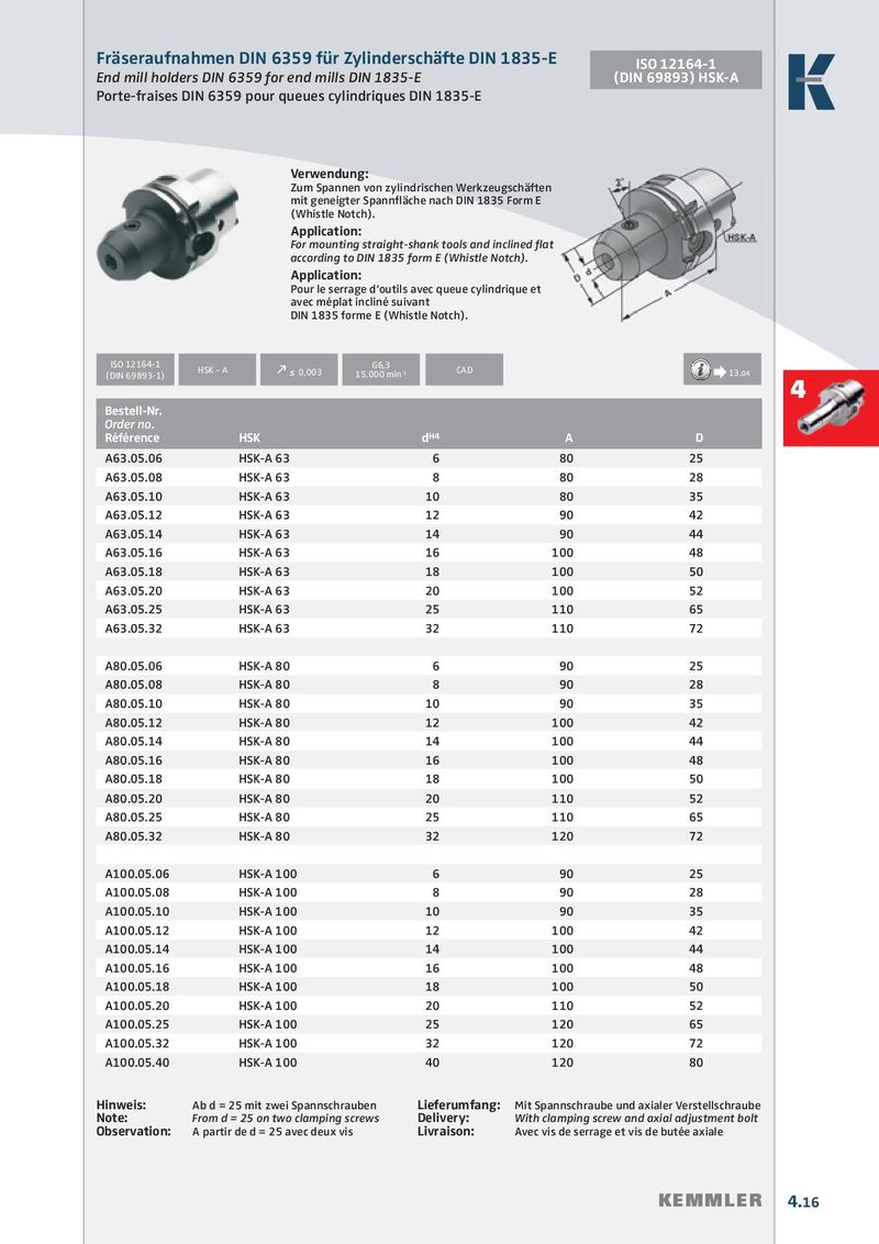 Fräseraufnahmen DIN 6359 für Zylinderschäfte DIN 1835-E ISO 12164-1 End mill holders DIN 6359 for end mills DIN 1835-E (DIN 69893) HSK-A Porte-fraises DIN 6359 pour queues cylindriques DIN 1835-E Verwendung: Zum Spannen von zylindrischen Werkzeugschäften mit geneigter Spannfl äche nach DIN 1835 Form E (Whistle Notch). Application: For mounting straight-shank tools and inclined flat according to DIN 1835 form E (Whistle Notch). Application: Pour le serrage d’outils avec queue cylindrique et avec méplat incliné suivant DIN 1835 forme E (Whistle Notch). ISO 12164-1 G6,3 HSK - A (DIN 69893-1) k ≤ 0,003 15.000 min -1 CAD Æ 13.04 4 Bestell-Nr. Order no. Référence HSK d H4 A D A63.05.06 HSK-A 63 6 80 25 A63.05.08 HSK-A 63 8 80 28 A63.05.10 HSK-A 63 10 80 35 A63.05.12 HSK-A 63 12 90 42 A63.05.14 HSK-A 63 14 90 44 A63.05.16 HSK-A 63 16 100 48 A63.05.18 HSK-A 63 18 100 50 A63.05.20 HSK-A 63 20 100 52 A63.05.25 HSK-A 63 25 110 65 A63.05.32 HSK-A 63 32 110 72 A80.05.06 HSK-A 80 6 90 25 A80.05.08 HSK-A 80 8 90 28 A80.05.10 HSK-A 80 10 90 35 A80.05.12 HSK-A 80 12 100 42 A80.05.14 HSK-A 80 14 100 44 A80.05.16 HSK-A 80 16 100 48 A80.05.18 HSK-A 80 18 100 50 A80.05.20 HSK-A 80 20 110 52 A80.05.25 HSK-A 80 25 110 65 A80.05.32 HSK-A 80 32 120 72 A100.05.06 HSK-A 100 6 90 25 A100.05.08 HSK-A 100 8 90 28 A100.05.10 HSK-A 100 10 90 35 A100.05.12 HSK-A 100 12 100 42 A100.05.14 HSK-A 100 14 100 44 A100.05.16 HSK-A 100 16 100 48 A100.05.18 HSK-A 100 18 100 50 A100.05.20 HSK-A 100 20 110 52 A100.05.25 HSK-A 100 25 120 65 A100.05.32 HSK-A 100 32 120 72 A100.05.40 HSK-A 100 40 120 80 Hinweis: Ab d = 25 mit zwei Spannschrauben Lieferumfang: Mit Spannschraube und axialer Verstellschraube Note: From d = 25 on two clamping screws Delivery: With clamping screw and axial adjustment bolt Observation: A partir de d = 25 avec deux vis Livraison: Avec vis de serrage et vis de butée axiale KEMMLER 4.16