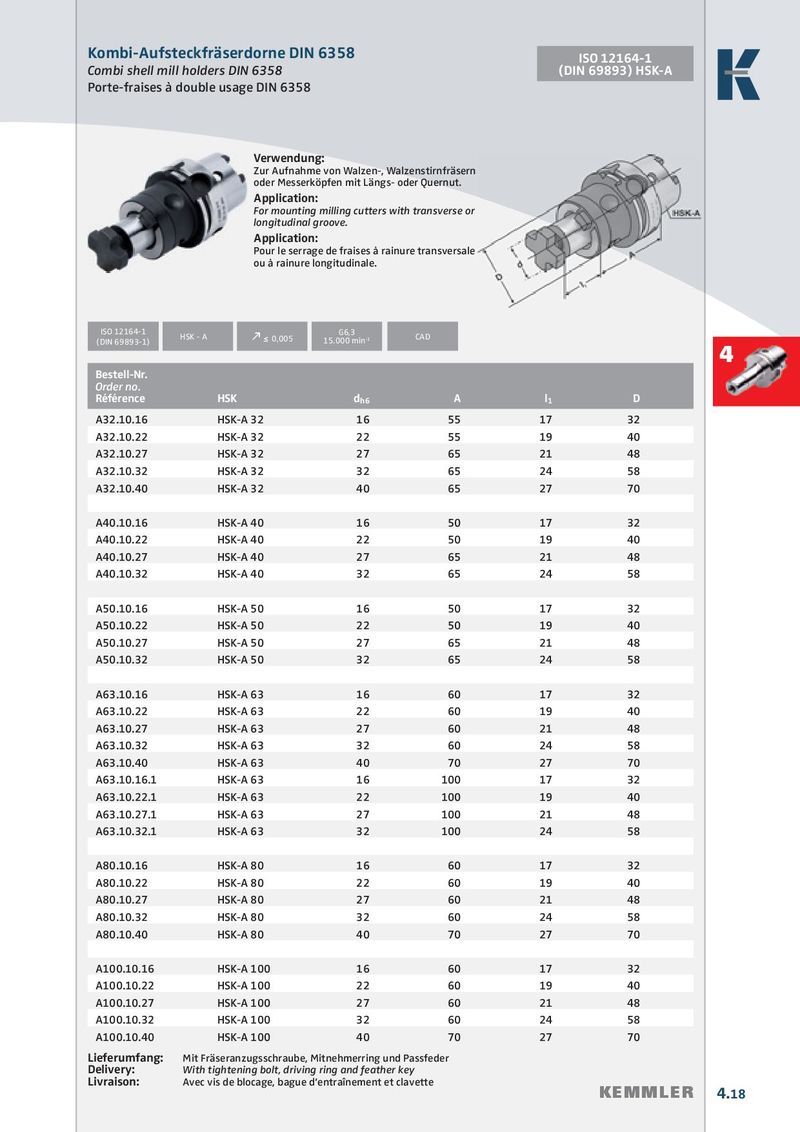Kombi-Aufsteckfräserdorne DIN 6358 ISO 12164-1 Combi shell mill holders DIN 6358 (DIN 69893) HSK-A Porte-fraises à double usage DIN 6358 Verwendung: Zur Aufnahme von Walzen-, Walzenstirnfräsern oder Messerköpfen mit Längs- oder Quernut. Application: For mounting milling cutters with transverse or longitudinal groove. Application: Pour le serrage de fraises à rainure trans versale ou à rainure longitu dinale. ISO 12164-1 G6,3 HSK - A (DIN 69893-1) k ≤ 0,005 CAD 15.000 min -1 4 Bestell-Nr. Order no. Référence HSK d h6 A l 1 D A32.10.16 HSK-A 32 16 55 17 32 A32.10.22 HSK-A 32 22 55 19 40 A32.10.27 HSK-A 32 27 65 21 48 A32.10.32 HSK-A 32 32 65 24 58 A32.10.40 HSK-A 32 40 65 27 70 A40.10.16 HSK-A 40 16 50 17 32 A40.10.22 HSK-A 40 22 50 19 40 A40.10.27 HSK-A 40 27 65 21 48 A40.10.32 HSK-A 40 32 65 24 58 A50.10.16 HSK-A 50 16 50 17 32 A50.10.22 HSK-A 50 22 50 19 40 A50.10.27 HSK-A 50 27 65 21 48 A50.10.32 HSK-A 50 32 65 24 58 A63.10.16 HSK-A 63 16 60 17 32 A63.10.22 HSK-A 63 22 60 19 40 A63.10.27 HSK-A 63 27 60 21 48 A63.10.32 HSK-A 63 32 60 24 58 A63.10.40 HSK-A 63 40 70 27 70 A63.10.16.1 HSK-A 63 16 100 17 32 A63.10.22.1 HSK-A 63 22 100 19 40 A63.10.27.1 HSK-A 63 27 100 21 48 A63.10.32.1 HSK-A 63 32 100 24 58 A80.10.16 HSK-A 80 16 60 17 32 A80.10.22 HSK-A 80 22 60 19 40 A80.10.27 HSK-A 80 27 60 21 48 A80.10.32 HSK-A 80 32 60 24 58 A80.10.40 HSK-A 80 40 70 27 70 A100.10.16 HSK-A 100 16 60 17 32 A100.10.22 HSK-A 100 22 60 19 40 A100.10.27 HSK-A 100 27 60 21 48 A100.10.32 HSK-A 100 32 60 24 58 A100.10.40 HSK-A 100 40 70 27 70 Lieferumfang: Mit Fräseranzugsschraube, Mitnehmerring und Passfeder Delivery: With tightening bolt, driving ring and feather key Livraison: Avec vis de blocage, bague d’entraînement et clavette KEMMLER 4.18