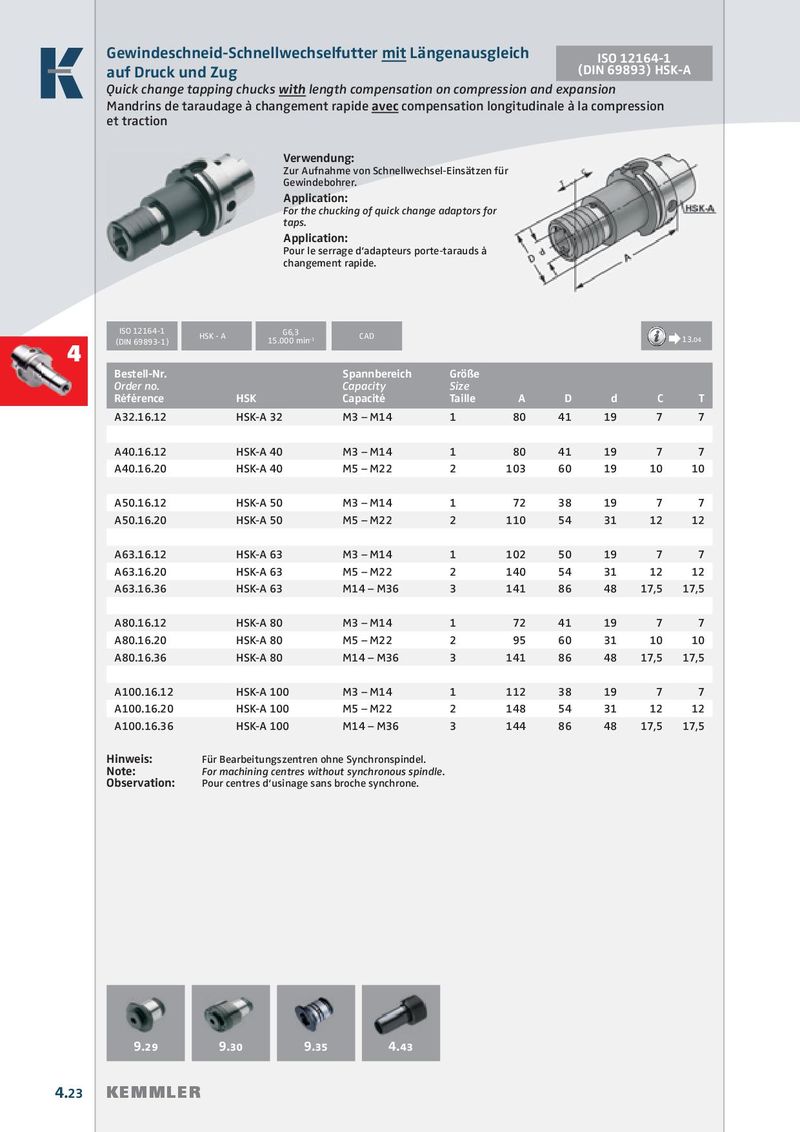 Gewindeschneid-Schnellwechselfutter mit Längenausgleich ISO 12164-1 auf Druck und Zug (DIN 69893) HSK-A Quick change tapping chucks with length compensation on compression and expansion Mandrins de taraudage à changement rapide avec compensation longitudinale à la compression et traction Verwendung: Zur Aufnahme von Schnellwechsel-Einsätzen für Gewindebohrer. Application: For the chucking of quick change adaptors for taps. Application: Pour le serrage d‘adapteurs porte-tarauds à changement rapide. ISO 12164-1 G6,3 HSK - A (DIN 69893-1) 15.000 min -1 CAD Æ 13.04 4 Bestell-Nr. Spannbereich Größe Order no. Capacity Size Référence HSK Capacité Taille A D d C T A32.16.12 HSK-A 32 M3 – M14 1 80 41 19 7 7 A40.16.12 HSK-A 40 M3 – M14 1 80 41 19 7 7 A40.16.20 HSK-A 40 M5 – M22 2 103 60 19 10 10 A50.16.12 HSK-A 50 M3 – M14 1 72 38 19 7 7 A50.16.20 HSK-A 50 M5 – M22 2 110 54 31 12 12 A63.16.12 HSK-A 63 M3 – M14 1 102 50 19 7 7 A63.16.20 HSK-A 63 M5 – M22 2 140 54 31 12 12 A63.16.36 HSK-A 63 M14 – M36 3 141 86 48 17,5 17,5 A80.16.12 HSK-A 80 M3 – M14 1 72 41 19 7 7 A80.16.20 HSK-A 80 M5 – M22 2 95 60 31 10 10 A80.16.36 HSK-A 80 M14 – M36 3 141 86 48 17,5 17,5 A100.16.12 HSK-A 100 M3 – M14 1 112 38 19 7 7 A100.16.20 HSK-A 100 M5 – M22 2 148 54 31 12 12 A100.16.36 HSK-A 100 M14 – M36 3 144 86 48 17,5 17,5 Hinweis: Für Bearbeitungszentren ohne Synchronspindel. Note: For machining centres without synchronous spindle. Observation: Pour centres d‘usinage sans broche synchrone. 9.29 9.30 9.35 4.43 4.23 KEMMLER