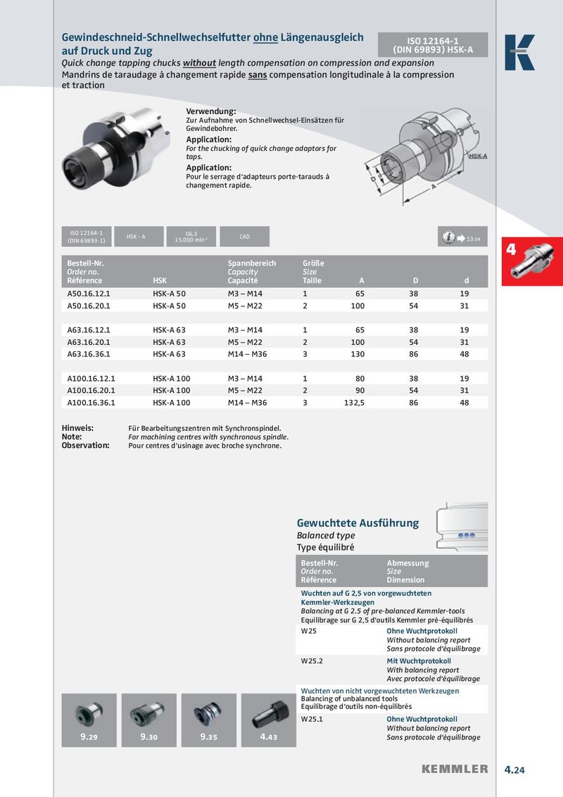 Gewindeschneid-Schnellwechselfutter ohne Längenausgleich ISO 12164-1 auf Druck und Zug (DIN 69893) HSK-A Quick change tapping chucks without length compensation on compression and expansion Mandrins de taraudage à changement rapide sans compensation longitudinale à la compression et traction Verwendung: Zur Aufnahme von Schnellwechsel-Einsätzen für Gewindebohrer. Application: For the chucking of quick change adaptors for taps. Application: Pour le serrage d‘adapteurs porte-tarauds à changement rapide. ISO 12164-1 G6,3 HSK - A (DIN 69893-1) 15.000 min -1 CAD Æ 13.04 4 Bestell-Nr. Spannbereich Größe Order no. Capacity Size Référence HSK Capacité Taille A D d A50.16.12.1 HSK-A 50 M3 – M14 1 65 38 19 A50.16.20.1 HSK-A 50 M5 – M22 2 100 54 31 A63.16.12.1 HSK-A 63 M3 – M14 1 65 38 19 A63.16.20.1 HSK-A 63 M5 – M22 2 100 54 31 A63.16.36.1 HSK-A 63 M14 – M36 3 130 86 48 A100.16.12.1 HSK-A 100 M3 – M14 1 80 38 19 A100.16.20.1 HSK-A 100 M5 – M22 2 90 54 31 A100.16.36.1 HSK-A 100 M14 – M36 3 132,5 86 48 Hinweis: Für Bearbeitungszentren mit Synchronspindel. Note: For machining centres with synchronous spindle. Observation: Pour centres d‘usinage avec broche synchrone. Gewuchtete Ausführung Balanced type Type équilibré Bestell-Nr. Abmessung Order no. Size Référence Dimension Wuchten auf G 2,5 von vorgewuchteten Kemmler-Werkzeugen Balancing at G 2.5 of pre-balanced Kemmler-tools Equilibrage sur G 2,5 d‘outils Kemmler pré-équilibrés W25 Ohne Wuchtprotokoll Without balancing report Sans protocole d‘équilibrage W25.2 Mit Wuchtprotokoll With balancing report Avec protocole d‘équilibrage Wuchten von nicht vorgewuchteten Werkzeugen Balancing of unbalanced tools Equilibrage d‘outils non-équilibrés W25.1 Ohne Wuchtprotokoll Without balancing report 9.29 9.30 9.35 4.43 Sans protocole d‘équilibrage KEMMLER 4.24