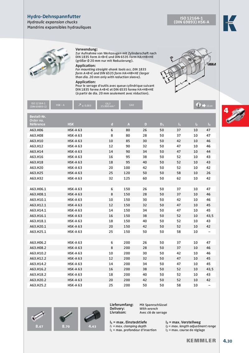 Hydro-Dehnspannfutter ISO 12164-1 Hydraulic expansion chucks (DIN 69893) HSK-A Mandrins expansibles hydrauliques Verwendung: Zur Aufnahme von Werkzeugen mit Zylinderschaft nach DIN 1835 Form A+B+E und DIN 6535 Form HA+HB+HE (größer Ø 20 mm nur mit Reduzierung). Application: For mounting straight-shank tools acc. DIN 1835 form A+B+E and DIN 6535 form HA+HB+HE (larger than dia. 20 mm only with reduction sleeve). Application: Pour le serrage d’outils avec queue cylindrique suivant DIN 1835 forme A+B+E et DIN 6535 forme HA+HB+HE (à partir de dia. 20 mm seulement avec réduction). ISO 12164-1 G6,3 HSK - A (DIN 69893-1) k ≤ 0,003 15.000 min -1 CAD Æ 13.04 4 Bestell-Nr. Order no. Référence HSK d A D D 1 l 1 l 2 l 3 A63.H06 HSK-A 63 6 80 26 50 37 10 47 A63.H08 HSK-A 63 8 80 28 50 37 10 47 A63.H10 HSK-A 63 10 85 30 50 42 10 46 A63.H12 HSK-A 63 12 90 32 50 47 10 46 A63.H14 HSK-A 63 14 90 34 50 47 10 44 A63.H16 HSK-A 63 16 95 38 50 52 10 43 A63.H18 HSK-A 63 18 95 40 50 52 10 43 A63.H20 HSK-A 63 20 100 42 50 52 10 42 A63.H25 HSK-A 63 25 120 50 50 58 10 26 A63.H32 HSK-A 63 32 125 60 50 62 10 42 A63.H06.1 HSK-A 63 6 150 26 50 37 10 47 A63.H08.1 HSK-A 63 8 150 28 50 37 10 46 A63.H10.1 HSK-A 63 10 150 30 50 42 10 46 A63.H12.1 HSK-A 63 12 150 32 50 47 10 45 A63.H14.1 HSK-A 63 14 150 34 50 47 10 45 A63.H16.1 HSK-A 63 16 150 38 50 52 10 43,5 A63.H18.1 HSK-A 63 18 150 40 50 52 10 43 A63.H20.1 HSK-A 63 20 150 42 50 52 10 42 A63.H25.1 HSK-A 63 25 150 50 50 58 10 – A63.H06.2 HSK-A 63 6 200 26 50 37 10 47 A63.H08.2 HSK-A 63 8 200 28 50 37 10 46 A63.H10.2 HSK-A 63 10 200 30 50 42 10 46 A63.H12.2 HSK-A 63 12 200 32 50 47 10 45 A63.H14.2 HSK-A 63 14 200 34 50 47 10 45 A63.H16.2 HSK-A 63 16 200 38 50 52 10 43,5 A63.H18.2 HSK-A 63 18 200 40 50 52 10 43 A63.H20.2 HSK-A 63 20 200 42 50 52 10 42 A63.H25.2 HSK-A 63 25 200 50 50 58 10 – Lieferumfang: Mit Spannschlüssel Delivery: With wrench Livraison: Avec clé de serrage l 1 = max. Einstecktiefe l 2 = max. Verstellweg 8.67 8.70 4.43 l 1 = max. clamping depth l 2 = max. length adjustment range l 1 = max. profondeur d’insertion l 2 = max. course de réglage KEMMLER 4.30