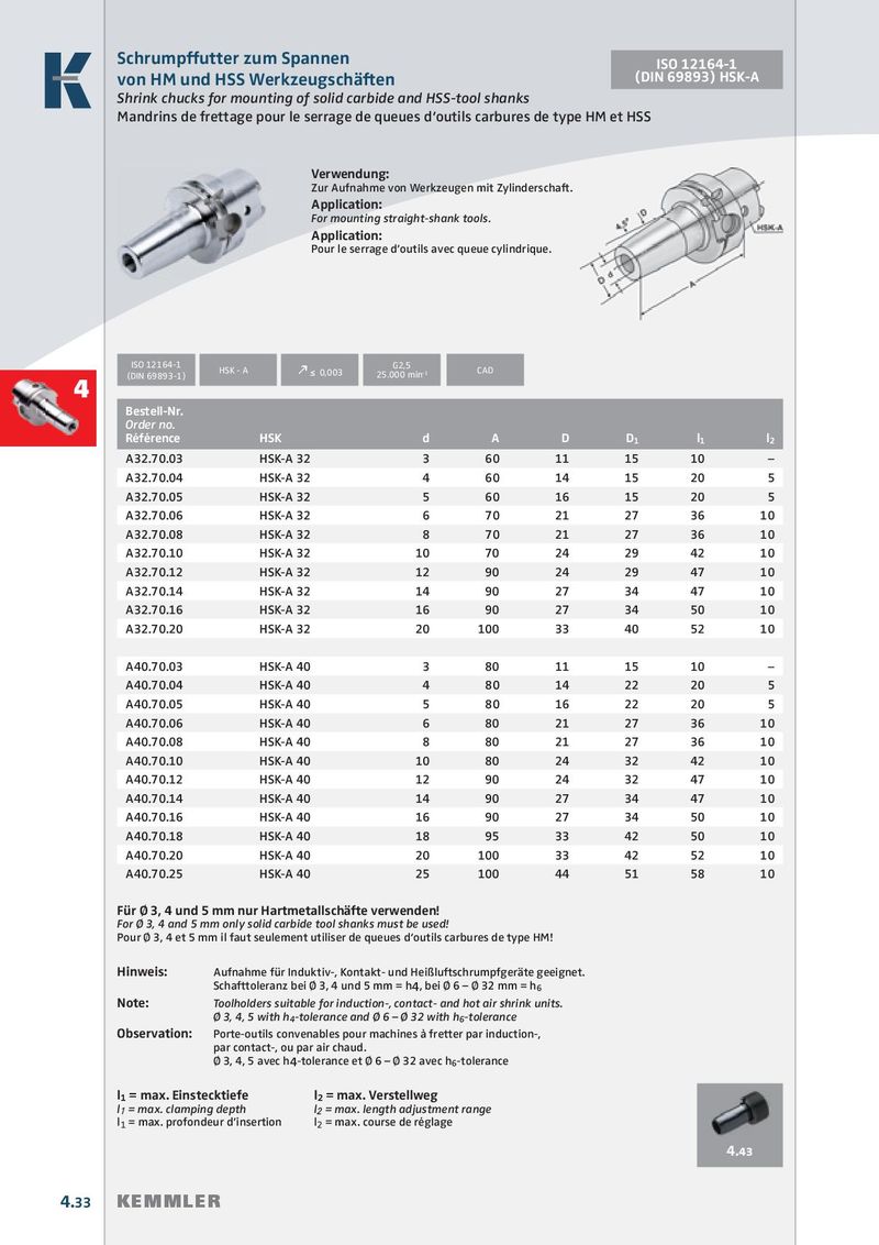 Schrumpffutter zum Spannen ISO 12164-1 von HM und HSS Werkzeugschäften (DIN 69893) HSK-A Shrink chucks for mounting of solid carbide and HSS-tool shanks Mandrins de frettage pour le serrage de queues d‘outils carbures de type HM et HSS Verwendung: Zur Aufnahme von Werkzeugen mit Zylinderschaft. Application: For mounting straight-shank tools. Application: Pour le serrage d’outils avec queue cylindrique. ISO 12164-1 G2,5 HSK - A (DIN 69893-1) k ≤ 0,003 CAD 25.000 min -1 4 Bestell-Nr. Order no. Référence HSK d A D D 1 l 1 l 2 A32.70.03 HSK-A 32 3 60 11 15 10 – A32.70.04 HSK-A 32 4 60 14 15 20 5 A32.70.05 HSK-A 32 5 60 16 15 20 5 A32.70.06 HSK-A 32 6 70 21 27 36 10 A32.70.08 HSK-A 32 8 70 21 27 36 10 A32.70.10 HSK-A 32 10 70 24 29 42 10 A32.70.12 HSK-A 32 12 90 24 29 47 10 A32.70.14 HSK-A 32 14 90 27 34 47 10 A32.70.16 HSK-A 32 16 90 27 34 50 10 A32.70.20 HSK-A 32 20 100 33 40 52 10 A40.70.03 HSK-A 40 3 80 11 15 10 – A40.70.04 HSK-A 40 4 80 14 22 20 5 A40.70.05 HSK-A 40 5 80 16 22 20 5 A40.70.06 HSK-A 40 6 80 21 27 36 10 A40.70.08 HSK-A 40 8 80 21 27 36 10 A40.70.10 HSK-A 40 10 80 24 32 42 10 A40.70.12 HSK-A 40 12 90 24 32 47 10 A40.70.14 HSK-A 40 14 90 27 34 47 10 A40.70.16 HSK-A 40 16 90 27 34 50 10 A40.70.18 HSK-A 40 18 95 33 42 50 10 A40.70.20 HSK-A 40 20 100 33 42 52 10 A40.70.25 HSK-A 40 25 100 44 51 58 10 Für Ø 3, 4 und 5 mm nur Hartmetallschäfte verwenden! For Ø 3, 4 and 5 mm only solid carbide tool shanks must be used! Pour Ø 3, 4 et 5 mm il faut seulement utiliser de queues d‘outils carbures de type HM! Hinweis: Aufnahme für Induktiv-, Kontakt- und Heißluftschrumpfgeräte geeignet. Schafttoleranz bei Ø 3, 4 und 5 mm = h 4 , bei Ø 6 – Ø 32 mm = h 6 Note: Toolholders suitable for induction-, contact- and hot air shrink units. Ø 3, 4, 5 with h 4 -tolerance and Ø 6 – Ø 32 with h 6 -tolerance Observation: Porte-outils convenables pour machines à fretter par induction-, par contact-, ou par air chaud. Ø 3, 4, 5 avec h 4 -tolerance et Ø 6 – Ø 32 avec h 6 -tolerance l 1 = max. Einstecktiefe l 2 = max. Verstellweg l 1 = max. clamping depth l 2 = max. length adjustment range l 1 = max. profondeur d’insertion l 2 = max. course de réglage 4.43 4.33 KEMMLER