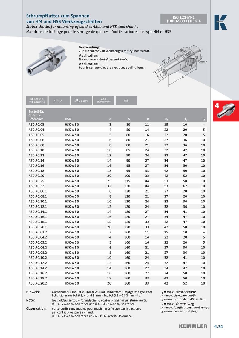 Schrumpffutter zum Spannen ISO 12164-1 von HM und HSS Werkzeugschäften (DIN 69893) HSK-A Shrink chucks for mounting of solid carbide and HSS-tool shanks Mandrins de frettage pour le serrage de queues d‘outils carbures de type HM et HSS Verwendung: Zur Aufnahme von Werkzeugen mit Zylinderschaft. Application: For mounting straight-shank tools. Application: Pour le serrage d’outils avec queue cylindrique. ISO 12164-1 G2,5 HSK - A (DIN 69893-1) k ≤ 0,003 25.000 min -1 CAD 4 Bestell-Nr. Order no. Référence HSK d A D D 1 l 1 l 2 A50.70.03 HSK-A 50 3 80 11 15 10 – A50.70.04 HSK-A 50 4 80 14 22 20 5 A50.70.05 HSK-A 50 5 80 16 22 20 5 A50.70.06 HSK-A 50 6 80 21 27 36 10 A50.70.08 HSK-A 50 8 80 21 27 36 10 A50.70.10 HSK-A 50 10 85 24 32 42 10 A50.70.12 HSK-A 50 12 90 24 32 47 10 A50.70.14 HSK-A 50 14 90 27 34 47 10 A50.70.16 HSK-A 50 16 95 27 34 50 10 A50.70.18 HSK-A 50 18 95 33 42 50 10 A50.70.20 HSK-A 50 20 100 33 42 52 10 A50.70.25 HSK-A 50 25 115 44 53 58 10 A50.70.32 HSK-A 50 32 120 44 53 62 10 A50.70.06.1 HSK-A 50 6 120 21 27 20 10 A50.70.08.1 HSK-A 50 8 120 21 27 20 10 A50.70.10.1 HSK-A 50 10 120 24 32 36 10 A50.70.12.1 HSK-A 50 12 120 24 32 36 10 A50.70.14.1 HSK-A 50 14 120 27 34 41 10 A50.70.16.1 HSK-A 50 16 120 27 34 47 10 A50.70.18.1 HSK-A 50 18 120 33 42 47 10 A50.70.20.1 HSK-A 50 20 120 33 42 50 10 A50.70.03.2 HSK-A 50 3 160 11 15 10 – A50.70.04.2 HSK-A 50 4 160 14 22 20 5 A50.70.05.2 HSK-A 50 5 160 16 22 20 5 A50.70.06.2 HSK-A 50 6 160 21 27 36 10 A50.70.08.2 HSK-A 50 8 160 21 27 36 10 A50.70.10.2 HSK-A 50 10 160 24 32 41 10 A50.70.12.2 HSK-A 50 12 160 24 32 47 10 A50.70.14.2 HSK-A 50 14 160 27 34 47 10 A50.70.16.2 HSK-A 50 16 160 27 34 50 10 A50.70.18.2 HSK-A 50 18 160 33 42 50 10 A50.70.20.2 HSK-A 50 20 160 33 42 52 10 Hinweis: Aufnahme für Induktiv-, Kontakt- und Heißluftschrumpfgeräte geeignet. l 1 = max. Einstecktiefe Schafttoleranz bei Ø 3, 4 und 5 mm = h 4 , bei Ø 6 – Ø 32 mm = h 6 l 1 = max. clamping depth Note: Toolholders suitable for induction-, contact- and hot air shrink units. l 1 = max. profondeur d’insertion Ø 3, 4, 5 with h 4 -tolerance and Ø 6 – Ø 32 with h 6 -tolerance l 2 = max. Verstellweg Observation: Porte-outils convenables pour machines à fretter par induction-, l 2 = max. length adjustment range par contact-, ou par air chaud. l 2 = max. course de réglage Ø 3, 4, 5 avec h 4 -tolerance et Ø 6 – Ø 32 avec h 6 -tolerance KEMMLER 4.34