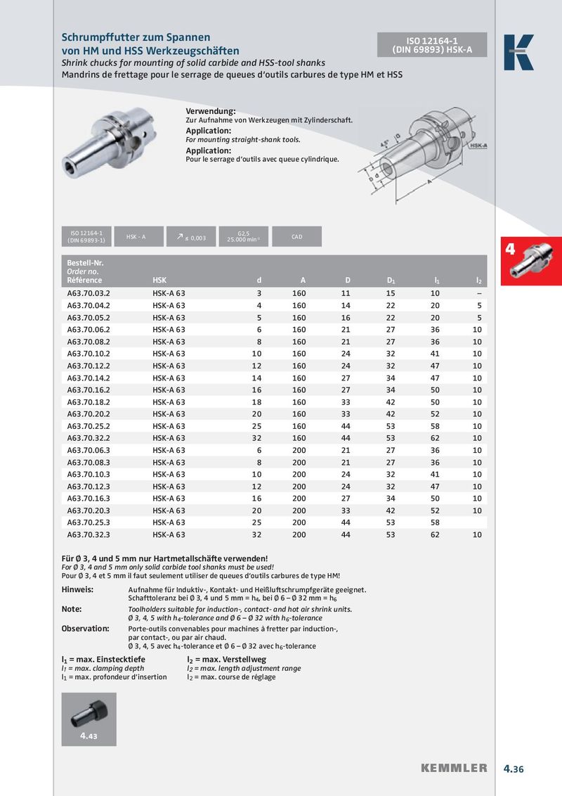 Schrumpffutter zum Spannen ISO 12164-1 von HM und HSS Werkzeugschäften (DIN 69893) HSK-A Shrink chucks for mounting of solid carbide and HSS-tool shanks Mandrins de frettage pour le serrage de queues d‘outils carbures de type HM et HSS Verwendung: Zur Aufnahme von Werkzeugen mit Zylinderschaft. Application: For mounting straight-shank tools. Application: Pour le serrage d’outils avec queue cylindrique. ISO 12164-1 G2,5 HSK - A (DIN 69893-1) k ≤ 0,003 CAD 25.000 min -1 4 Bestell-Nr. Order no. Référence HSK d A D D 1 l 1 l 2 A63.70.03.2 HSK-A 63 3 160 11 15 10 – A63.70.04.2 HSK-A 63 4 160 14 22 20 5 A63.70.05.2 HSK-A 63 5 160 16 22 20 5 A63.70.06.2 HSK-A 63 6 160 21 27 36 10 A63.70.08.2 HSK-A 63 8 160 21 27 36 10 A63.70.10.2 HSK-A 63 10 160 24 32 41 10 A63.70.12.2 HSK-A 63 12 160 24 32 47 10 A63.70.14.2 HSK-A 63 14 160 27 34 47 10 A63.70.16.2 HSK-A 63 16 160 27 34 50 10 A63.70.18.2 HSK-A 63 18 160 33 42 50 10 A63.70.20.2 HSK-A 63 20 160 33 42 52 10 A63.70.25.2 HSK-A 63 25 160 44 53 58 10 A63.70.32.2 HSK-A 63 32 160 44 53 62 10 A63.70.06.3 HSK-A 63 6 200 21 27 36 10 A63.70.08.3 HSK-A 63 8 200 21 27 36 10 A63.70.10.3 HSK-A 63 10 200 24 32 41 10 A63.70.12.3 HSK-A 63 12 200 24 32 47 10 A63.70.16.3 HSK-A 63 16 200 27 34 50 10 A63.70.20.3 HSK-A 63 20 200 33 42 52 10 A63.70.25.3 HSK-A 63 25 200 44 53 58 A63.70.32.3 HSK-A 63 32 200 44 53 62 10 Für Ø 3, 4 und 5 mm nur Hartmetallschäfte verwenden! For Ø 3, 4 and 5 mm only solid carbide tool shanks must be used! Pour Ø 3, 4 et 5 mm il faut seulement utiliser de queues d‘outils carbures de type HM! Hinweis: Aufnahme für Induktiv-, Kontakt- und Heißluftschrumpfgeräte geeignet. Schafttoleranz bei Ø 3, 4 und 5 mm = h 4 , bei Ø 6 – Ø 32 mm = h 6 Note: Toolholders suitable for induction-, contact- and hot air shrink units. Ø 3, 4, 5 with h 4 -tolerance and Ø 6 – Ø 32 with h 6 -tolerance Observation: Porte-outils convenables pour machines à fretter par induction-, par contact-, ou par air chaud. Ø 3, 4, 5 avec h 4 -tolerance et Ø 6 – Ø 32 avec h 6 -tolerance l 1 = max. Einstecktiefe l 2 = max. Verstellweg l 1 = max. clamping depth l 2 = max. length adjustment range l 1 = max. profondeur d’insertion l 2 = max. course de réglage 4.43 KEMMLER 4.36