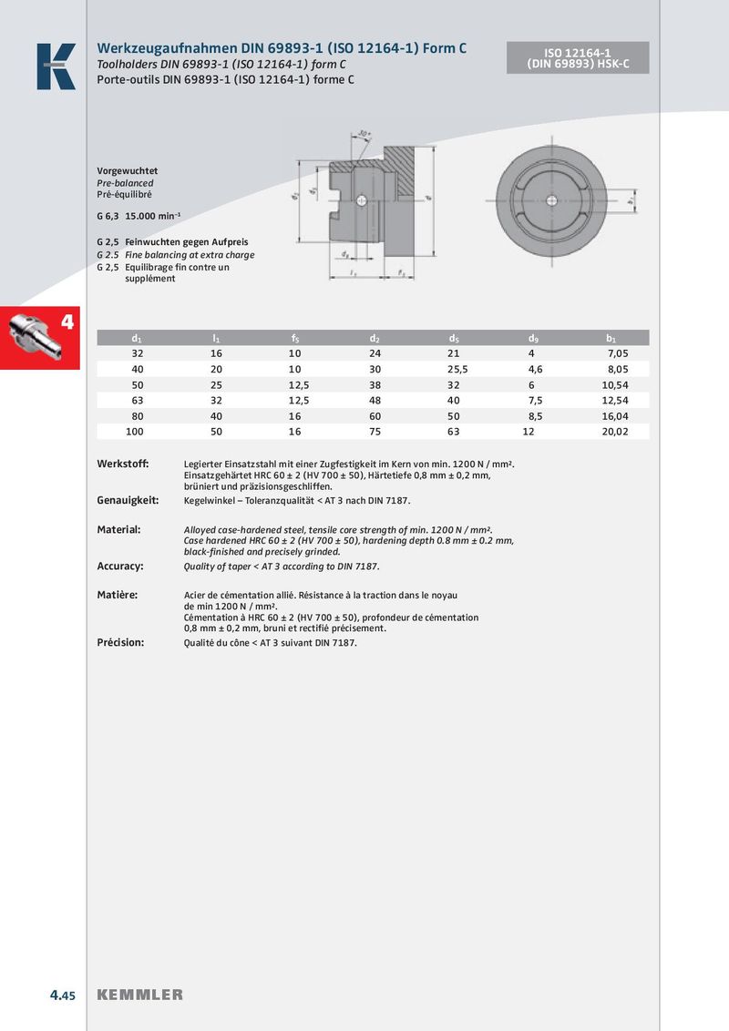Werkzeugaufnahmen DIN 69893-1 (ISO 12164-1) Form C ISO 12164-1 Toolholders DIN 69893-1 (ISO 12164-1) form C (DIN 69893) HSK-C Porte-outils DIN 69893-1 (ISO 12164-1) forme C Vorgewuchtet Pre-balanced Pré-équilibré G 6,3 15.000 min –1 G 2,5 Feinwuchten gegen Aufpreis G 2.5 Fine balancing at extra charge G 2,5 Equilibrage fi n contre un supplément 4 d 1 l 1 f 5 d 2 d 5 d 9 b 1 32 16 10 24 21 4 7,05 40 20 10 30 25,5 4,6 8,05 50 25 12,5 38 32 6 10,54 63 32 12,5 48 40 7,5 12,54 80 40 16 60 50 8,5 16,04 100 50 16 75 63 12 20,02 Werkstoff: Legierter Einsatzstahl mit einer Zugfestigkeit im Kern von min. 1200 N / mm². Einsatzgehärtet HRC 60 ± 2 (HV 700 ± 50), Härtetiefe 0,8 mm ± 0,2 mm, brüniert und präzisionsgeschliffen. Genauigkeit: Kegelwinkel – Toleranzqualität < AT 3 nach DIN 7187. Material: Alloyed case-hardened steel, tensile core strength of min. 1200 N / mm². Case hardened HRC 60 ± 2 (HV 700 ± 50), hardening depth 0.8 mm ± 0.2 mm, black-fi nished and precisely grinded. Accuracy: Quality of taper < AT 3 according to DIN 7187. Matière: Acier de cémentation allié. Résistance à la traction dans le noyau de min 1200 N / mm². Cémentation à HRC 60 ± 2 (HV 700 ± 50), profondeur de cémentation 0,8 mm ± 0,2 mm, bruni et rectifié précisement. Précision: Qualité du cône < AT 3 suivant DIN 7187. 4.45 KEMMLER