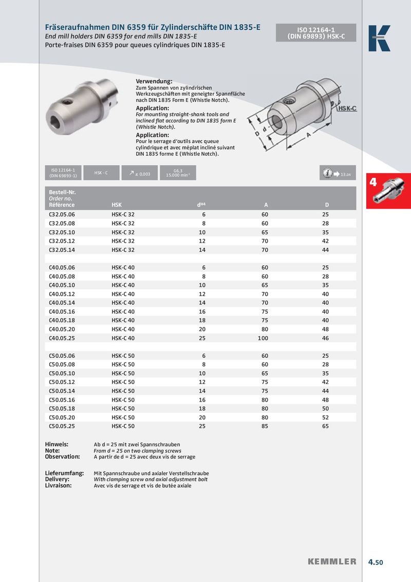 Fräseraufnahmen DIN 6359 für Zylinderschäfte DIN 1835-E ISO 12164-1 End mill holders DIN 6359 for end mills DIN 1835-E (DIN 69893) HSK-C Porte-fraises DIN 6359 pour queues cylindriques DIN 1835-E Verwendung: Zum Spannen von zylindrischen Werkzeugschäften mit geneigter Spannfläche nach DIN 1835 Form E (Whistle Notch). Application: For mounting straight-shank tools and inclined fl at according to DIN 1835 form E (Whistle Notch). Application: Pour le serrage d’outils avec queue cylindrique et avec méplat incliné suivant DIN 1835 forme E (Whistle Notch). ISO 12164-1 G6,3 HSK - C (DIN 69893-1) k ≤ 0,003 15.000 min -1 Æ 13.04 4 Bestell-Nr. Order no. Référence HSK d H4 A D C32.05.06 HSK-C 32 6 60 25 C32.05.08 HSK-C 32 8 60 28 C32.05.10 HSK-C 32 10 65 35 C32.05.12 HSK-C 32 12 70 42 C32.05.14 HSK-C 32 14 70 44 C40.05.06 HSK-C 40 6 60 25 C40.05.08 HSK-C 40 8 60 28 C40.05.10 HSK-C 40 10 65 35 C40.05.12 HSK-C 40 12 70 40 C40.05.14 HSK-C 40 14 70 40 C40.05.16 HSK-C 40 16 75 40 C40.05.18 HSK-C 40 18 75 40 C40.05.20 HSK-C 40 20 80 48 C40.05.25 HSK-C 40 25 100 46 C50.05.06 HSK-C 50 6 60 25 C50.05.08 HSK-C 50 8 60 28 C50.05.10 HSK-C 50 10 65 35 C50.05.12 HSK-C 50 12 75 42 C50.05.14 HSK-C 50 14 75 44 C50.05.16 HSK-C 50 16 80 48 C50.05.18 HSK-C 50 18 80 50 C50.05.20 HSK-C 50 20 80 52 C50.05.25 HSK-C 50 25 85 65 Hinweis: Ab d = 25 mit zwei Spannschrauben Note: From d = 25 on two clamping screws Observation: A partir de d = 25 avec deux vis de serrage Lieferumfang: Mit Spannschraube und axialer Verstellschraube Delivery: With clamping screw and axial adjustment bolt Livraison: Avec vis de serrage et vis de butée axiale KEMMLER 4.50