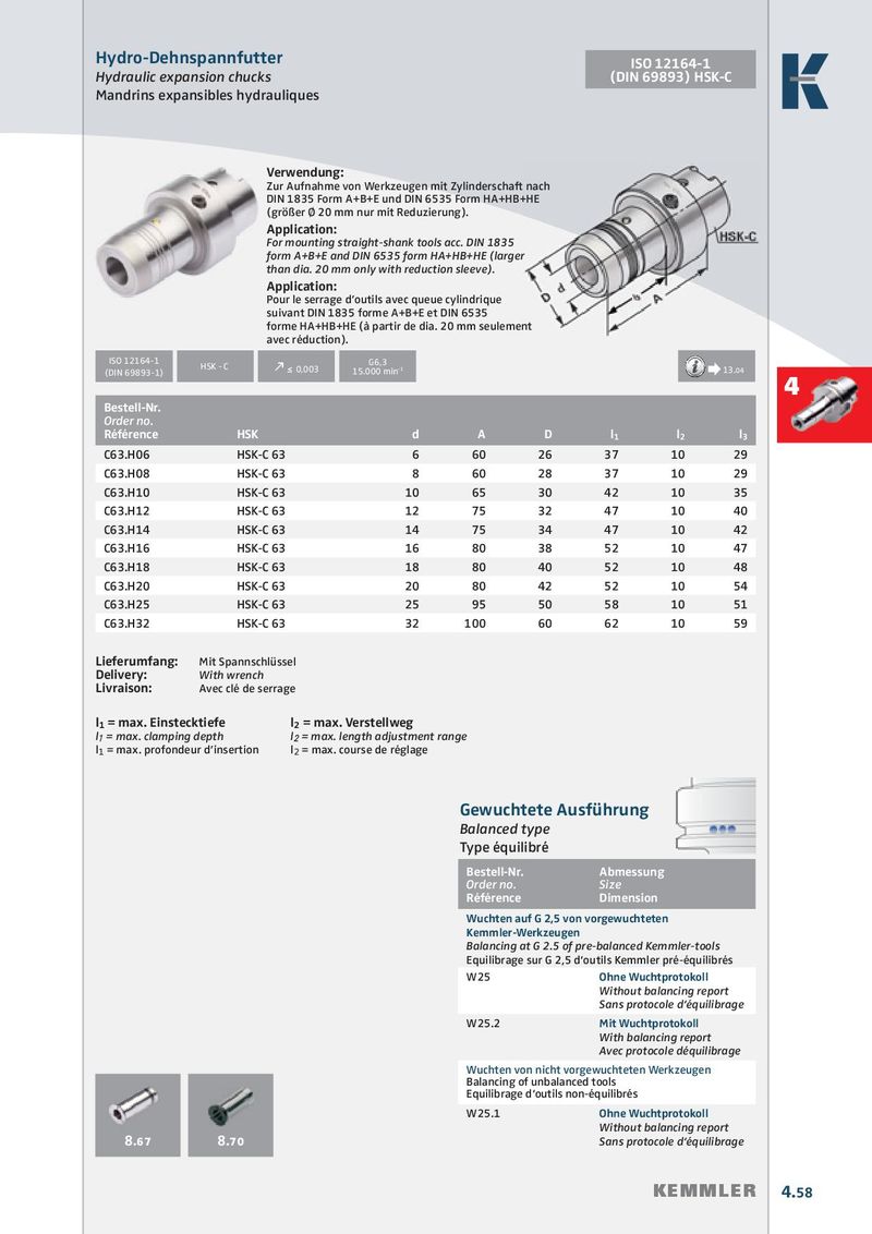 Hydro-Dehnspannfutter ISO 12164-1 Hydraulic expansion chucks (DIN 69893) HSK-C Mandrins expansibles hydrauliques Verwendung: Zur Aufnahme von Werkzeugen mit Zylinderschaft nach DIN 1835 Form A+B+E und DIN 6535 Form HA+HB+HE (größer Ø 20 mm nur mit Reduzierung). Application: For mounting straight-shank tools acc. DIN 1835 form A+B+E and DIN 6535 form HA+HB+HE (larger than dia. 20 mm only with reduction sleeve). Application: Pour le serrage d’outils avec queue cylindrique suivant DIN 1835 forme A+B+E et DIN 6535 forme HA+HB+HE (à partir de dia. 20 mm seulement avec réduction). ISO 12164-1 G6,3 HSK - C (DIN 69893-1) k ≤ 0,003 15.000 min -1 Æ 13.04 4 Bestell-Nr. Order no. Référence HSK d A D l 1 l 2 l 3 C63.H06 HSK-C 63 6 60 26 37 10 29 C63.H08 HSK-C 63 8 60 28 37 10 29 C63.H10 HSK-C 63 10 65 30 42 10 35 C63.H12 HSK-C 63 12 75 32 47 10 40 C63.H14 HSK-C 63 14 75 34 47 10 42 C63.H16 HSK-C 63 16 80 38 52 10 47 C63.H18 HSK-C 63 18 80 40 52 10 48 C63.H20 HSK-C 63 20 80 42 52 10 54 C63.H25 HSK-C 63 25 95 50 58 10 51 C63.H32 HSK-C 63 32 100 60 62 10 59 Lieferumfang: Mit Spannschlüssel Delivery: With wrench Livraison: Avec clé de serrage l 1 = max. Einstecktiefe l 2 = max. Verstellweg l 1 = max. clamping depth l 2 = max. length adjustment range l 1 = max. profondeur d’insertion l 2 = max. course de réglage Gewuchtete Ausführung Balanced type Type équilibré Bestell-Nr. Abmessung Order no. Size Référence Dimension Wuchten auf G 2,5 von vorgewuchteten Kemmler-Werkzeugen Balancing at G 2.5 of pre-balanced Kemmler-tools Equilibrage sur G 2,5 d‘outils Kemmler pré-équilibrés W25 Ohne Wuchtprotokoll Without balancing report Sans protocole d‘équilibrage W25.2 Mit Wuchtprotokoll With balancing report Avec protocole déquilibrage Wuchten von nicht vorgewuchteten Werkzeugen Balancing of unbalanced tools Equilibrage d‘outils non-équilibrés W25.1 Ohne Wuchtprotokoll Without balancing report 8.67 8.70 Sans protocole d‘équilibrage KEMMLER 4.58